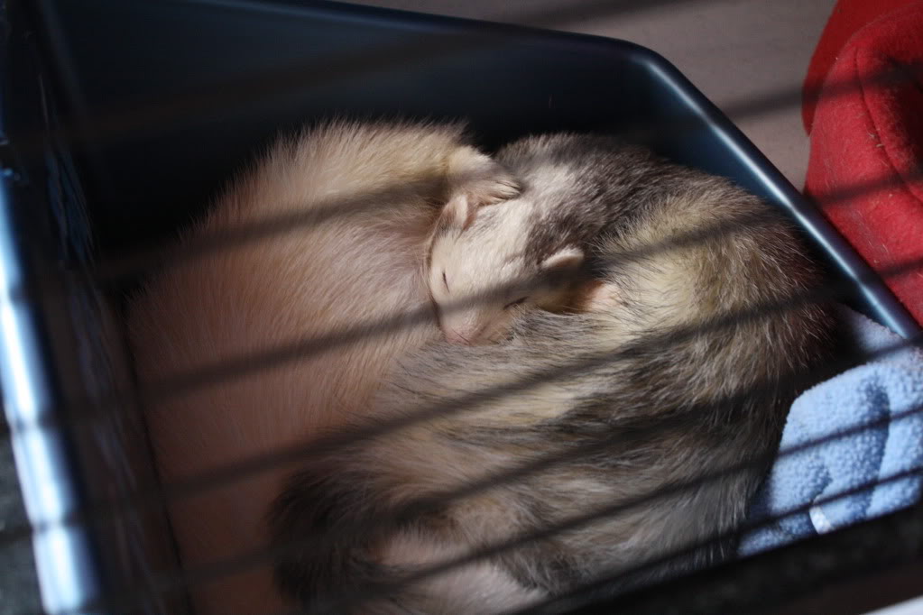 In addition they require a very large cage. Ours is pretty average and measures about 5'2" tall, 2'6" wide, and 1'6" deep. It is the MidWest brand Ferret Nation double cage, which is one of the most popular chin cages. They need something to excersise in, too. Balls are not recommended as they don't really make them large enough to not cause back problems long term. We special ordered a wheel for ours that is over a foot in diameter so that she can use it daily without injuring her back.