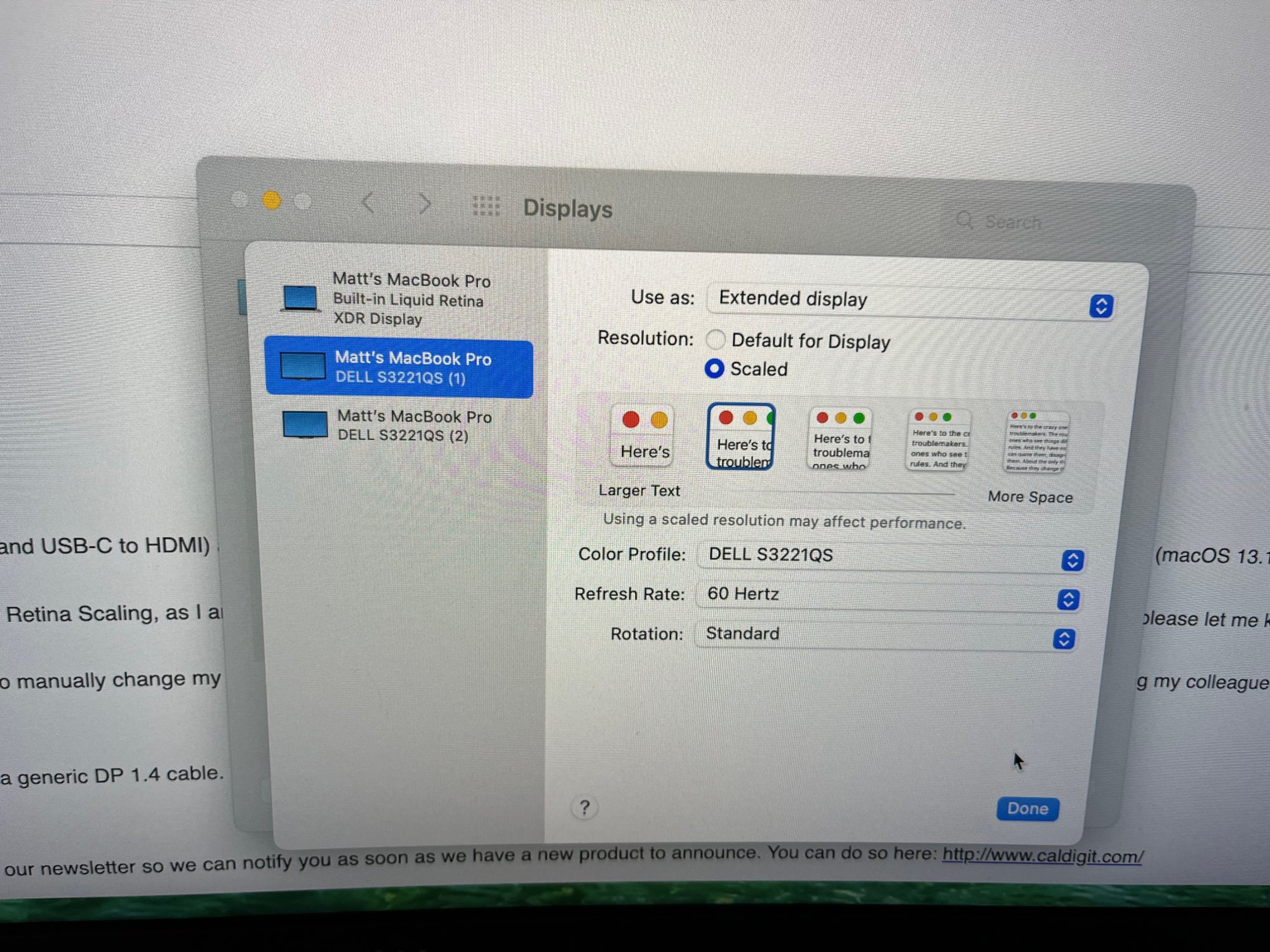 The behavior is Apple's Retina Scaling display features (thumbnail options) are not available when using the DP connection (of any kind). The other issue is that when using two USBC to HDMI adapters, from the Mac directly OR from the TS4, I cannot get both monitors to display 4K@60Hz. The second monitor is always 30Hz. If I mix one adapter with one one-piece cable (USBC to HDMI), I am able to get both monitors @60Hz (the cables use a Parade PS186 chipset and the adapters use a Realtek RTD2172U chipset).