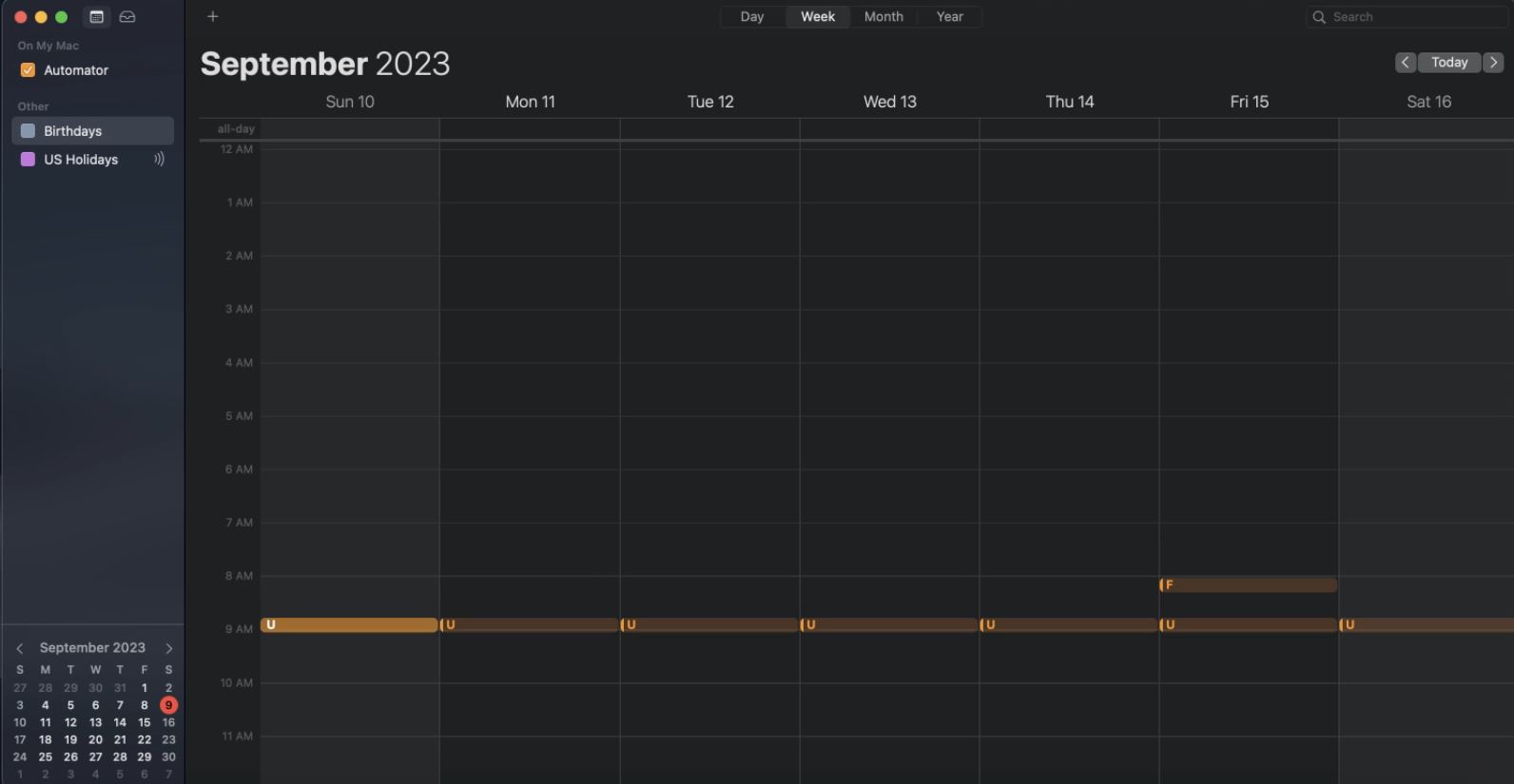 We have 2 events. There are not shared with any device or the cloud. All they do, through a shell script is run 2 small programs from within our Accounting system to print out 2 reports. One is daily at 8:45am and the other is 8:00am on Friday. That is it. They come as calendar events from the Automator App: