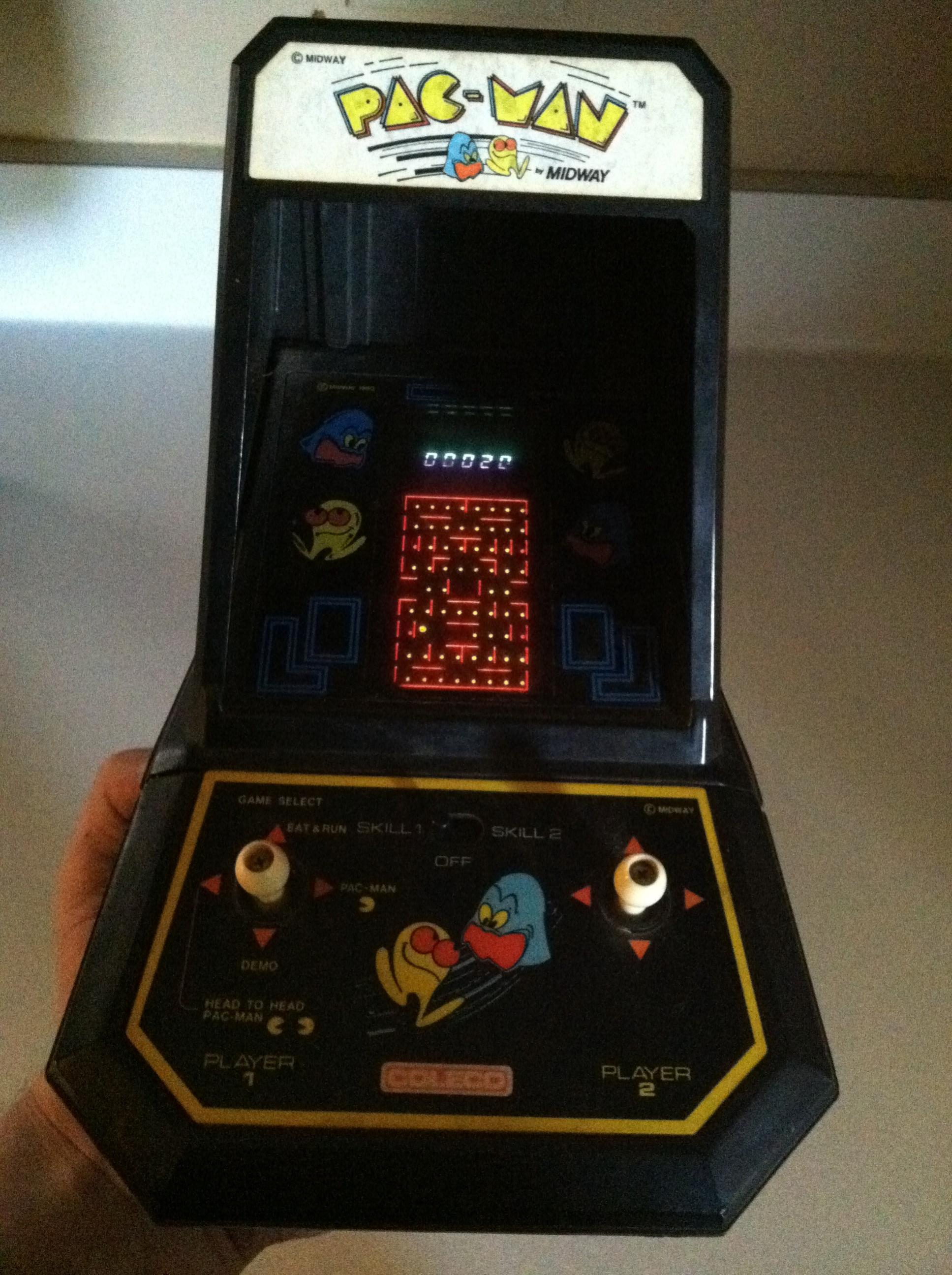 I'm looking for the name (and possibly an image) of an electronic game (possibly more from the 80's) that was made of plastic (white) with 9 colored buttons (back lighted) and sounds. You could play 10 (maybe 12) different games like: baseball, roulette, simmon, etc.