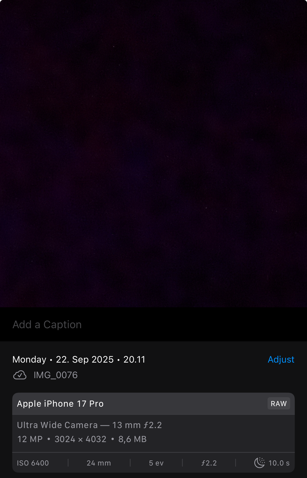The IP15P, IP16P and IP17P EXIF data will now show 10 seconds for a 30 seconds exposure shots, b/c it's actually 3 x 10 seconds stacked together for more clarity. Apple is calling this Photonic Engine for Night Mode, Shane Mosstyn discovered it in his IP15P Milky Way video, this fixed the star trails from the 30 seconds long exposure shots the IP14P had in 2022.