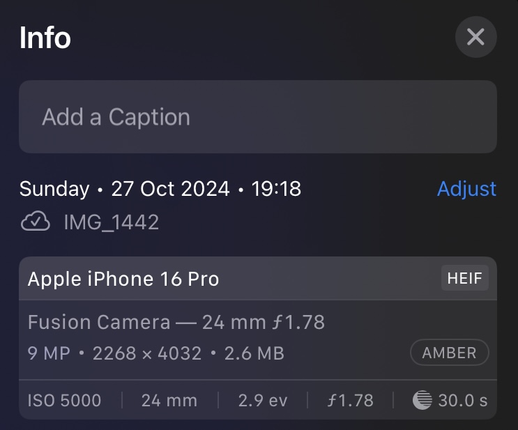 18.1 didn't fix it for me that for sure. I want to see Apple acknowledge the issue first then release an update that specifically says it fixes the issue.. 18.1 release notes didn't mention anything about a fix for this so I doubt they did anything to address itSpoke with Apple tech support today, and they informed me that they had released a fix in iOS 18.1 for this issue. However, my situation worsened while I was testing the fix with phone flat on couch. I noticed since 18.1 that the camera was going up to 10,000 ISO, whereas before on iOS 18.01, they only reached 5,000 ISO. This higher ISO setting is likely the reason for the worsening issue. While my Astro photos appear to be okay, the ISO setting was only at 2500.