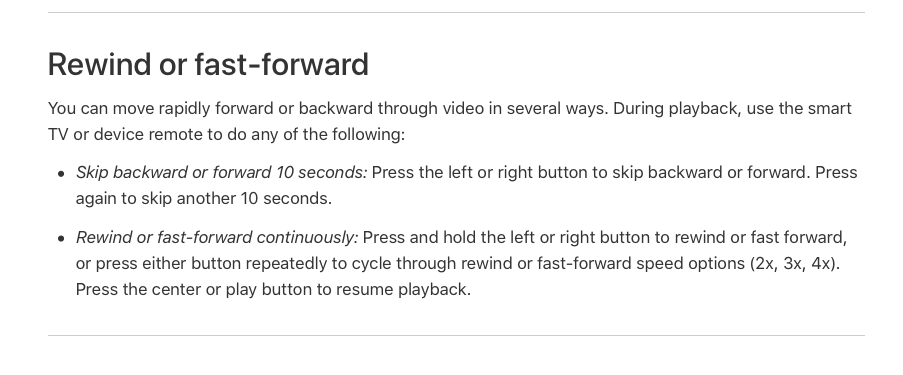The Apple TV control center app in iOS/iPadOS has buttons to skip forward or go backward 10 seconds, which I use all the time when watching YouTube. When clicking the direction wheel on the new Apple TV remote, it doesn't do that. Curious if there is a way to achieve this.