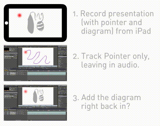 I was thinking it would be great if I could use a different app (like Animate?) where I could take the original recording's audio and motion tracking, and put that on top of a picture-track. Then I could have a couple of different picture-tracks with different versions of the slides (eg thin lines or bold lines) and the viewer could click a button to seamless switch between which picture-track they're viewing as the audio and pointer presentation plays. Also they could switch between desired pointer shapes.