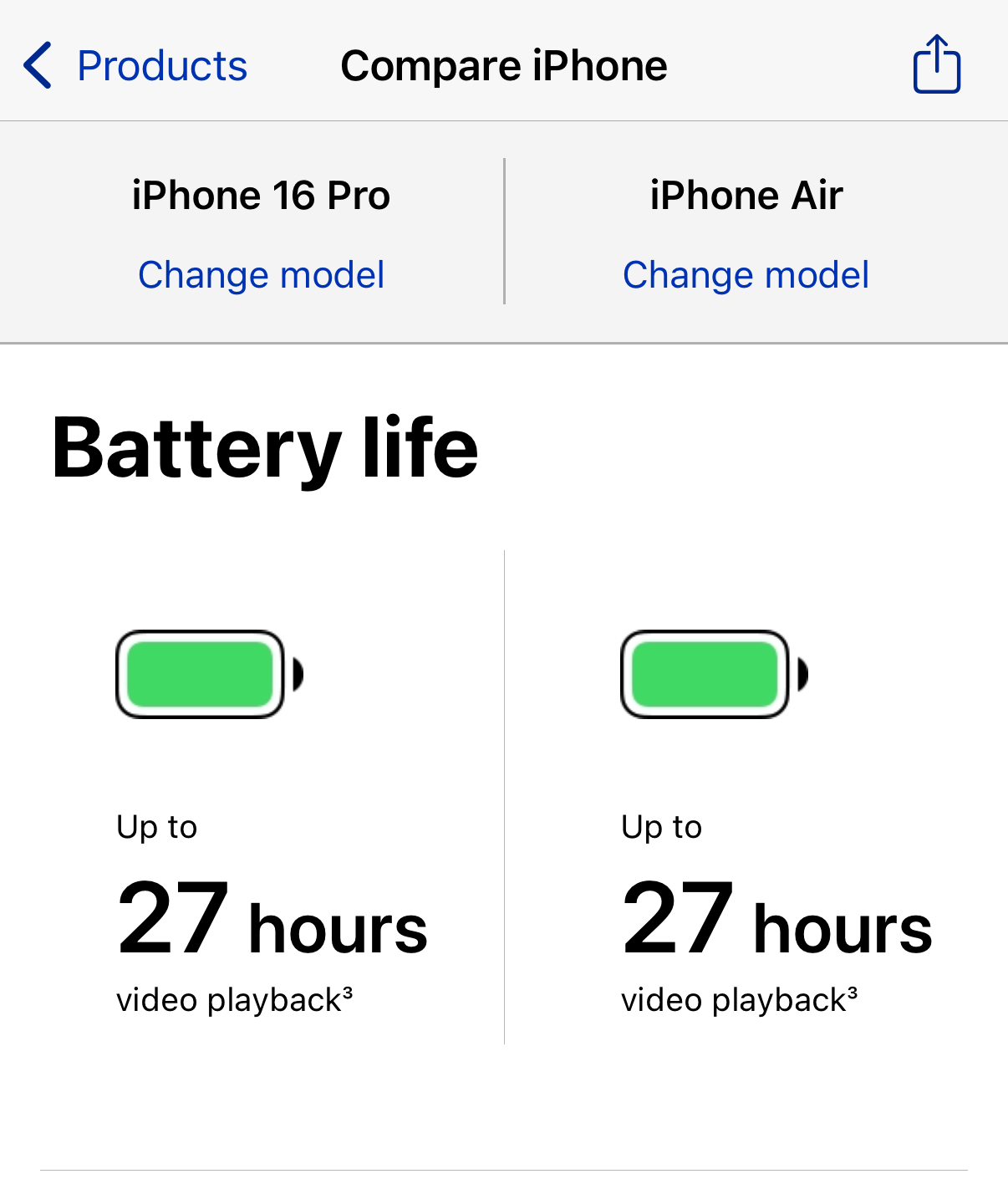 Video playback does not equal to real battery performance, music playback hours is a better indicator (and guess what apple removed them for comparison). Last time I remembered, the Pro Max could reach 95 hours yet the regular and the pro could only do 75 hours in one generation, a very compelling index.Same battery life as my iPhone 16 pro?