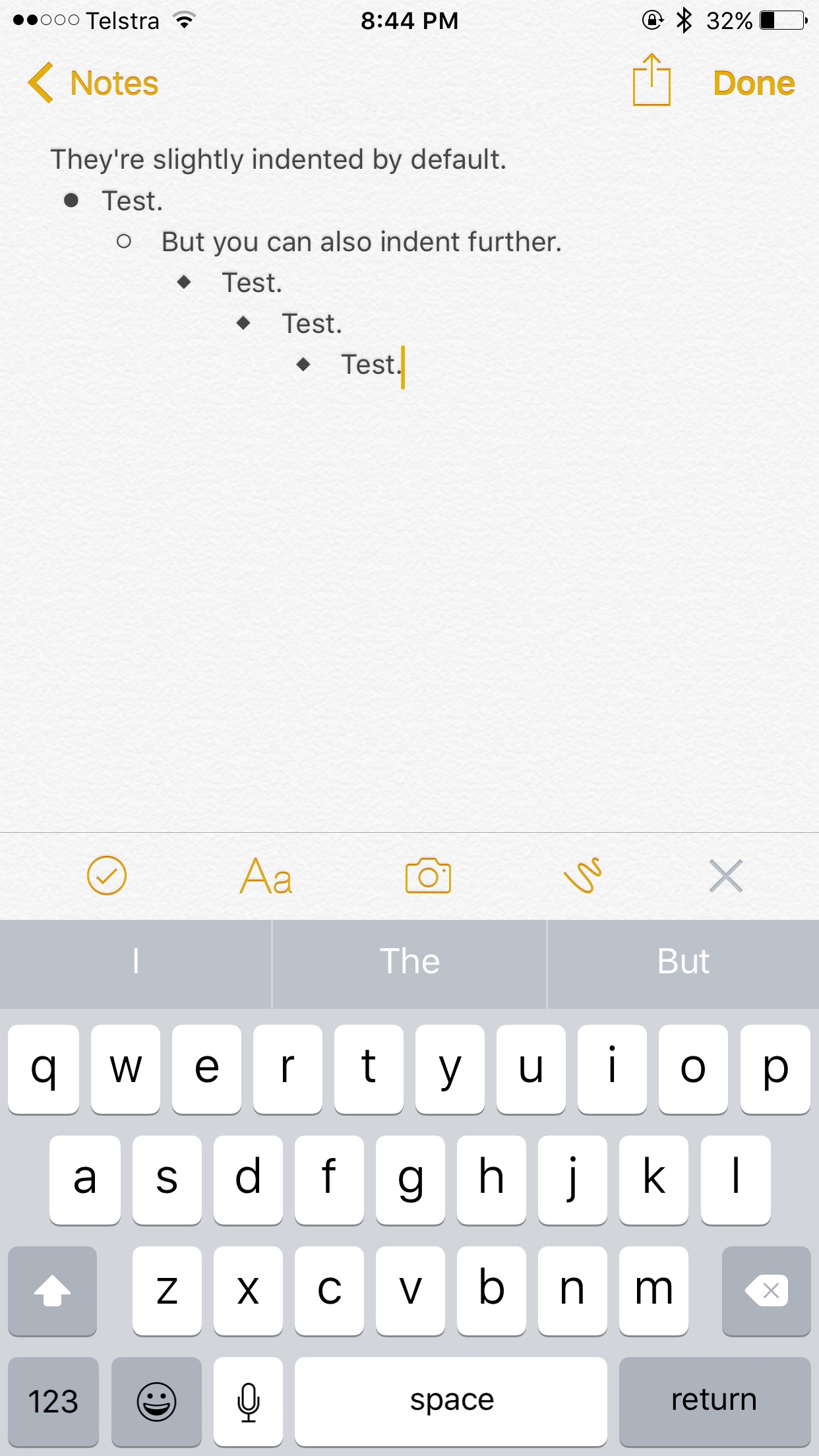 Tab does not work to indent bulleted lists on a bluetooth keyboard. Have to press and hold on the screen