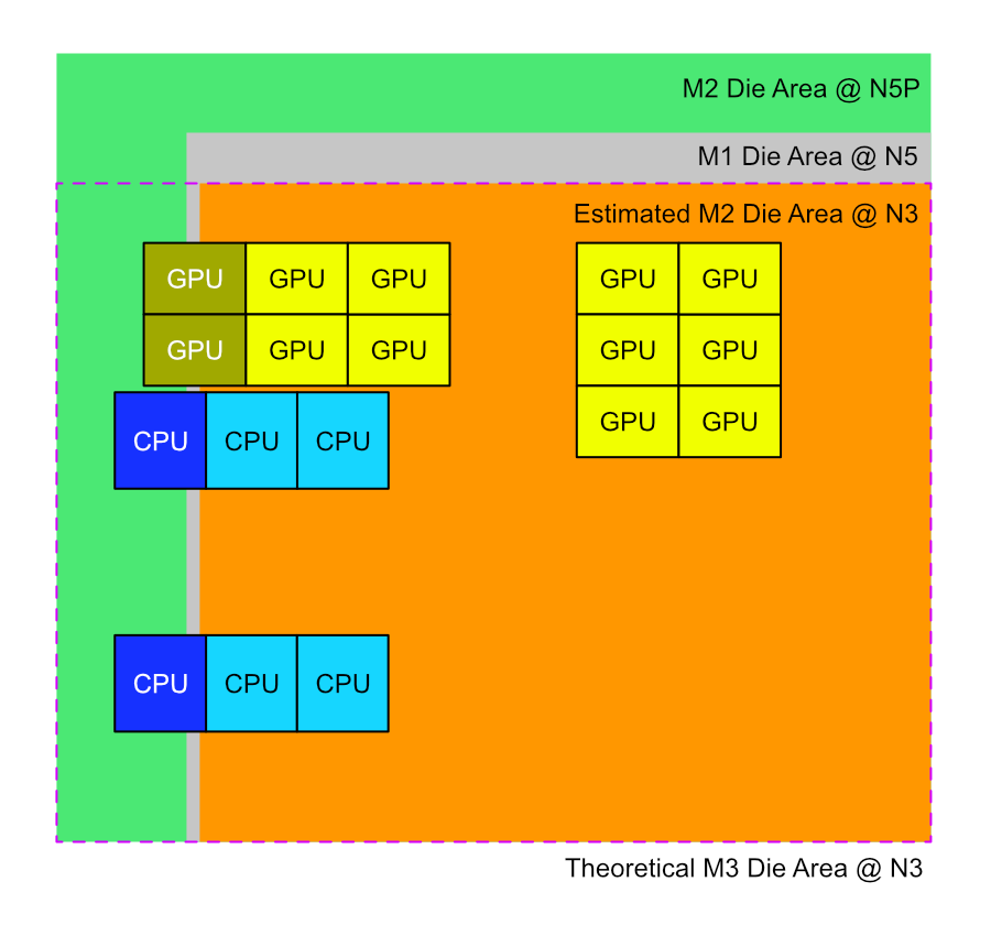 Here is a block diagram showing the relative die areas between the M1, M2 and the M2 if it was scaled down using the N3 process: