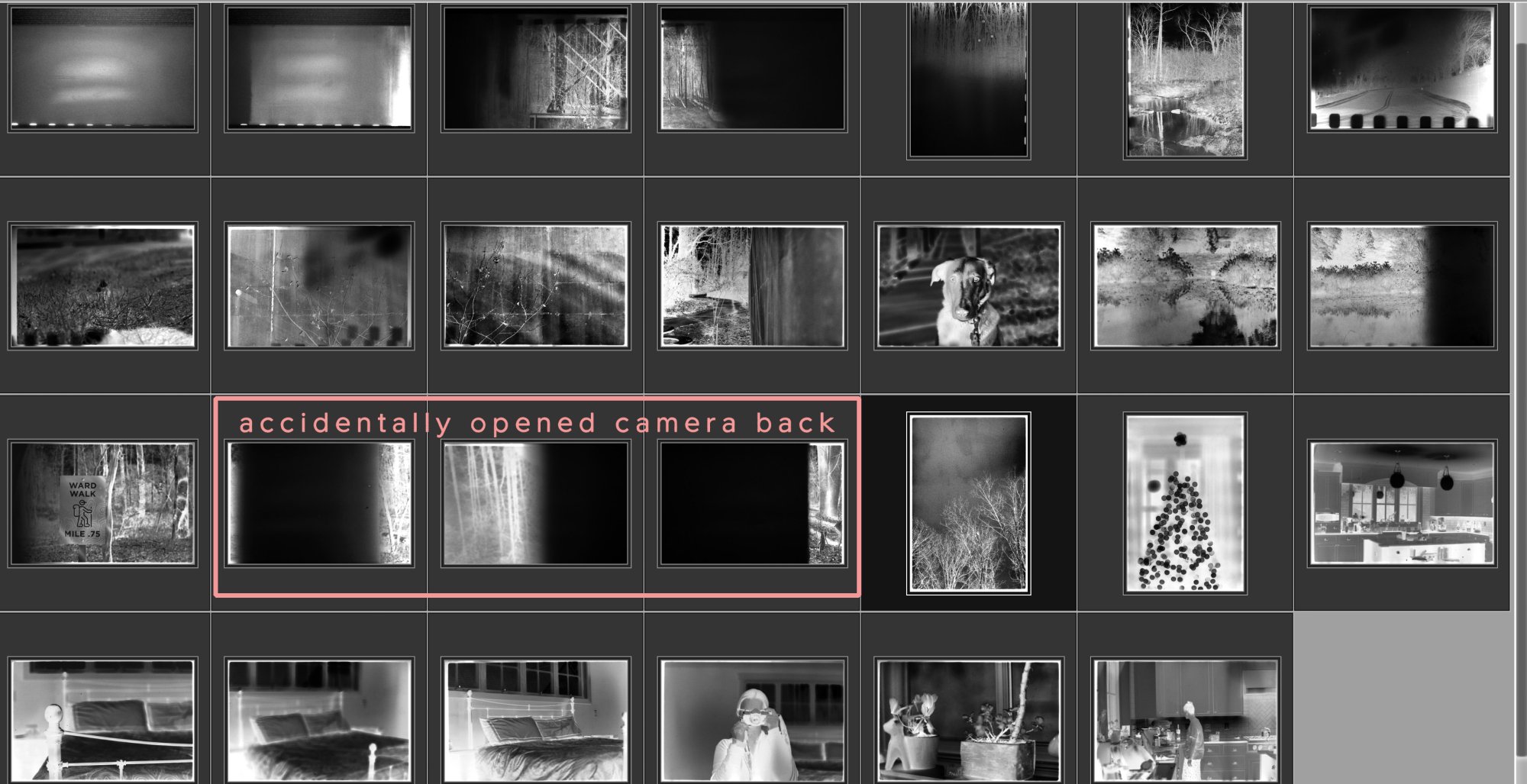 Well I can't explain that, but in the past I must admit I have opened my fair share of camera backs. And I have encountered similar results. I never seen something like that happen from film developing gone wrong. It's been my experience if film touches film in the development process is gets glued together, and the resulting marks are more organic. The sprocket marks I seeing look exposed on to the film.okay, good to know. but why are the first few frames basically ruined, and then some good ones in the middle, before the back opened? i mean, clearly the back opening didn't ruin the entire roll.