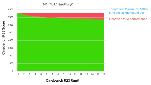 The original graph by @Mike Boreham and updated graph by @G5isAlive show that even higher throttling on M2 is still faster than M1 which is relatively cooler. Compare M1 MBA with Intel MBA with fan, there is no comparison even with Throttling and no fan in either M2 or M1 MBA.