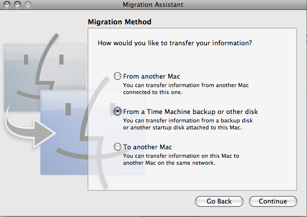 Apple Genius wasn't much help today. They said you couldn't back up specific files from Time Machine after a clean install. Bunch of lackeys. They even said you can't use Migration Assistant to pull files from Time Machine, since Migration assist is only for going from one computer to another computer. You can't use it on the same machine. I guess they haven't tested Migration Assist since it shows the following: