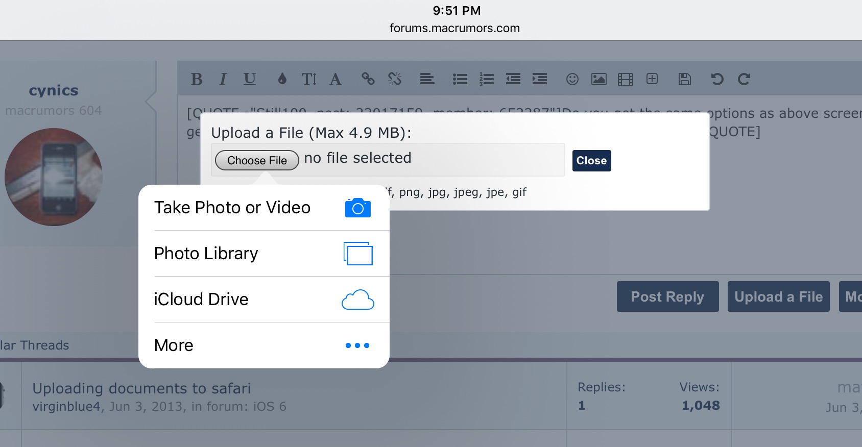 I'm a little confused. You can upload iCloud Drive stuff with iOS 9.0.0/1/2 via safari.
