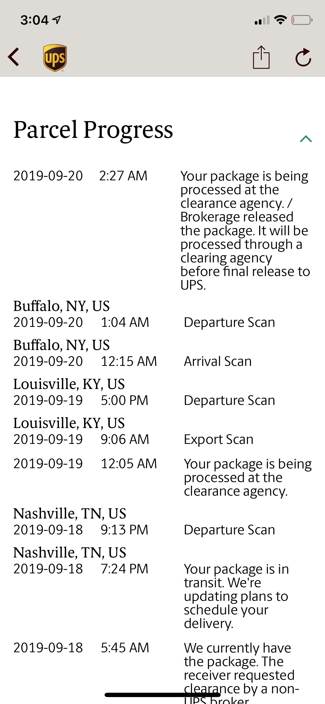 Exactly same for me. Am in GTA.I initially had a departure scan from Louisville at 2PM but another new departure scan from Louisville appeared at 5PM, anyone else with similar tracking history?