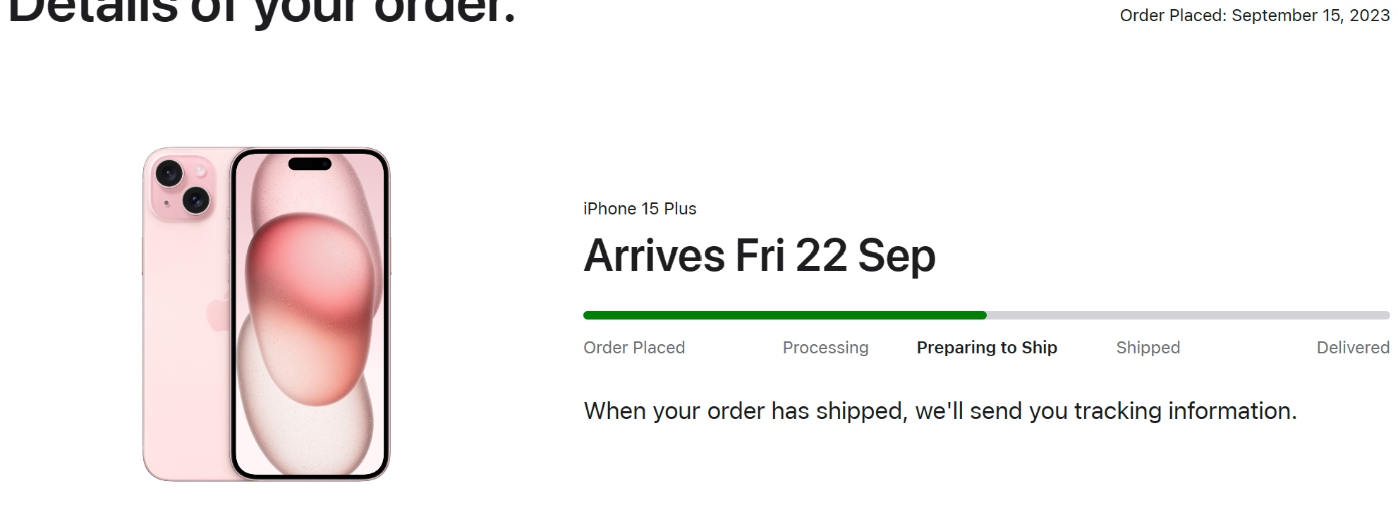 We are tracking our phones on UPS my choice. If I go in my app or apple site it shows the same as you. Should soon change to shipped on that page.I don't get it?!?! The status details of my order haven't changed since Saturday evening. The status is still stuck at "Preparing to Ship". Maybe because I ordered a "Pink" iPhone 15 Plus????