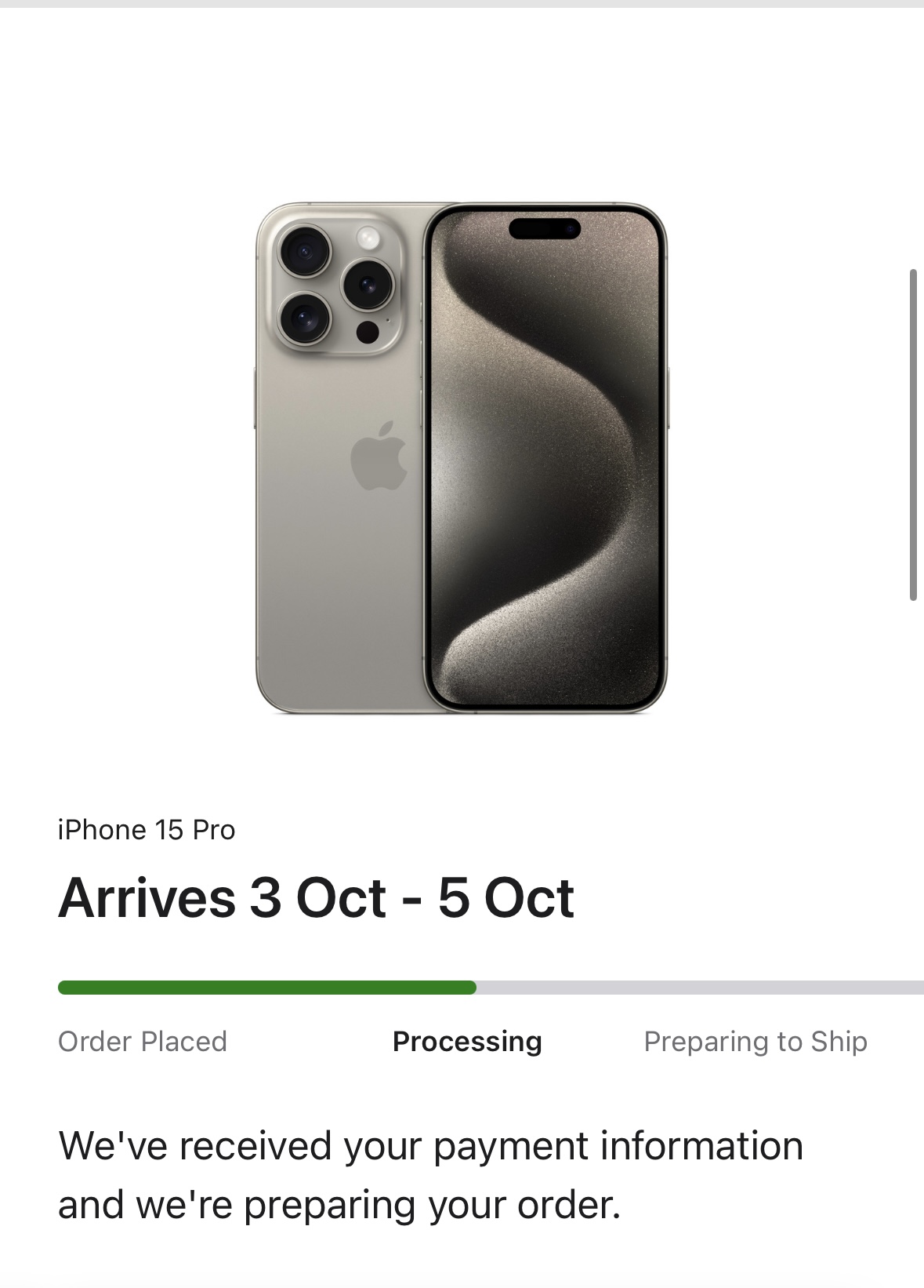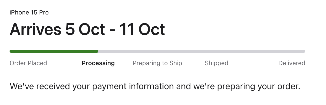 No charge to my card, no movement at all. Ordered 21 minutes after preorder started due to connection issues and it got pushed back. My partner’s pro max in blue is currently out for delivery… no fun for me.Anyone with October delivery date, but has their order status to "preparing to ship"? Mine is still at "processing":