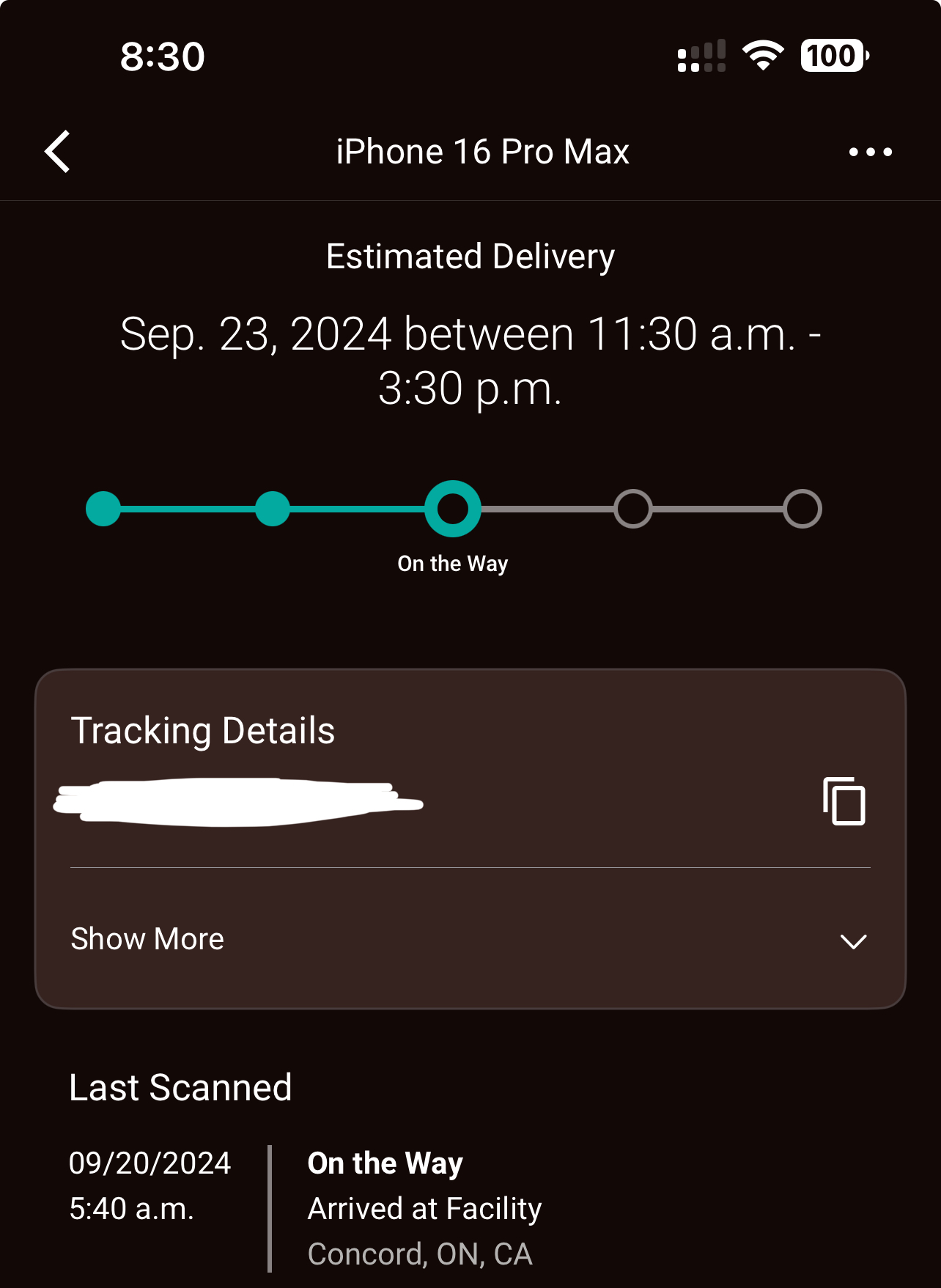 I had the 5:40 Concord scan and mine is now out for delivery. All good.Barrie, On here . 5:40am Concord Scan. Delivery still listed as before 7pm today on UPS.