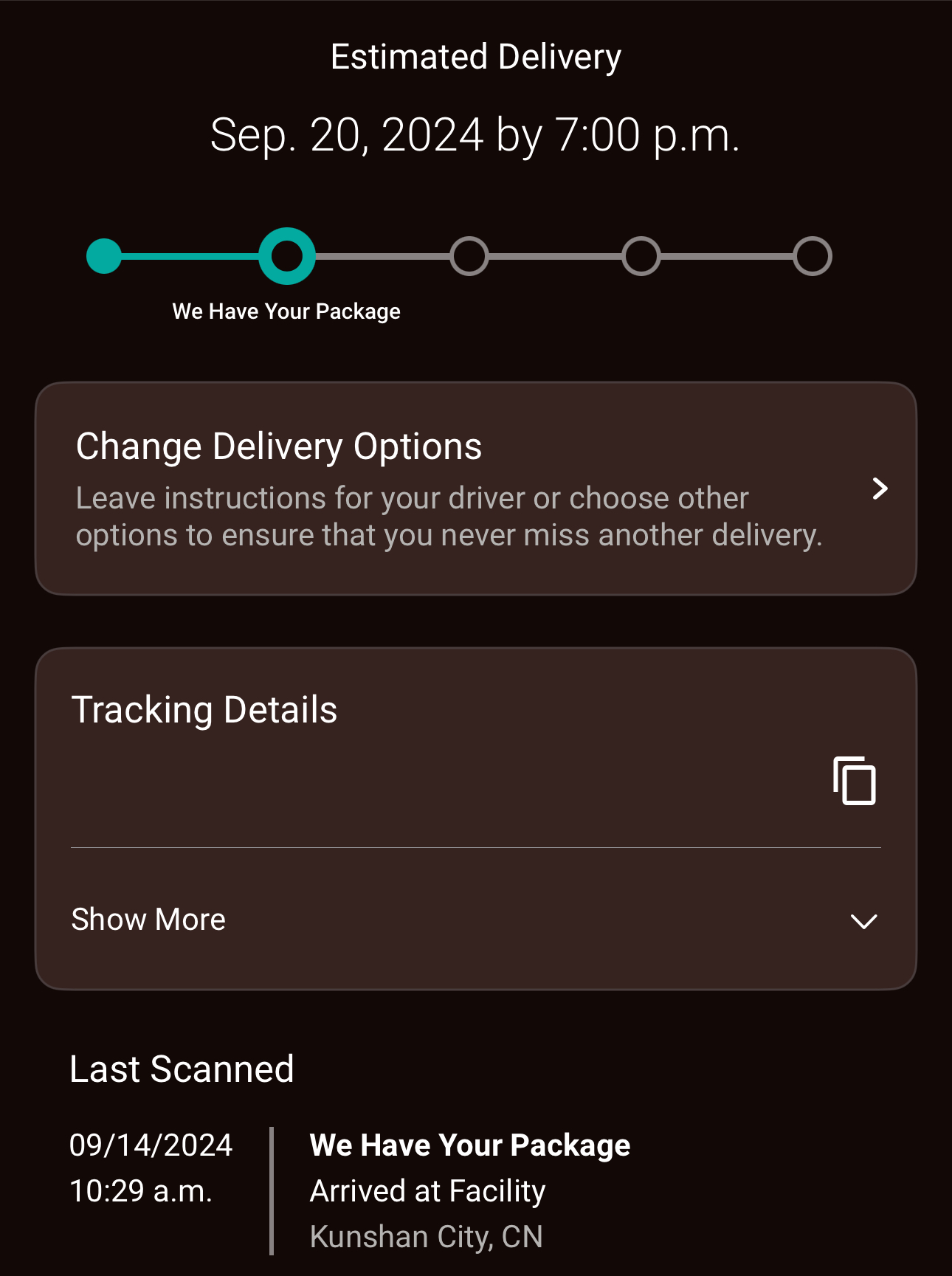 If you have UPS My Choice, you should have a tracking number. Mine just showed up. My order is on the move. There’s a facility scan in Kunshan City, China. Estimated delivery date is showing September 20th.
