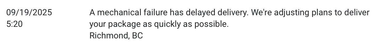 Yep...same thing with mine. The plane was 2hrs late so we shall see who really gets delayed. Probably Vancouver people will be okay. Not sure about me on the island or people in the interior??“A mechanical failure has delayed delivery. We're adjusting plans to deliver your package as quickly as possible.