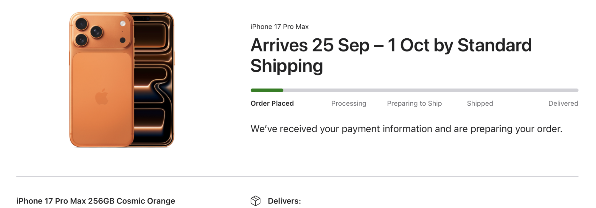 Your phone shows Sep 19 for me as of 8:20am. Is your postal code in a remote area?Ordered placed for Cosmic Orange 256 GB 17 PM. Had set up the reservation a few days ago.