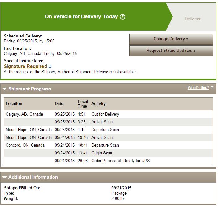 I'm in Ottawa (Kanata to be exact). Mine was at Mount Hope (near Hamilton) at 6:45am, but by 7:32am it found its way to the Ottawa area, at Gloucester. Arrival Scan