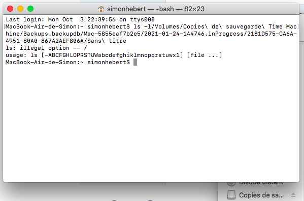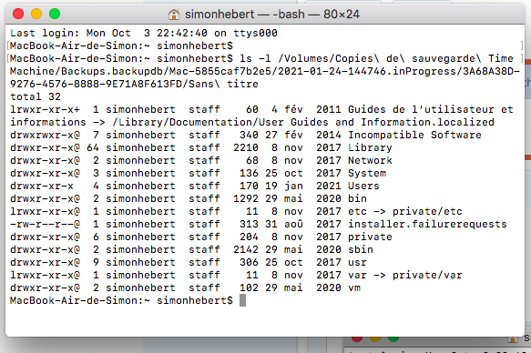 So what you're saying here is that the files are okay and so is the hard drive?No worries. Terminal commands are easy to misunderstand and to mistype. So, that command shows you that the Sans titre file contains your Time Machine backup of your Mac. The folders are there, but you can't open the Sans titre folder for some reason.