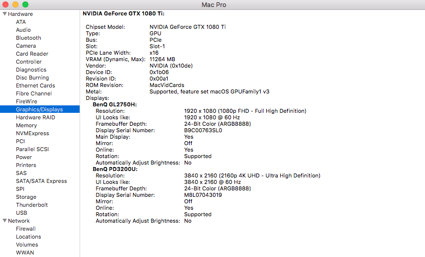 7. I shut down the Mac Pro. Took out the ATI Radeon. I then installed my Geforce 1080Ti. I hit the power button and she booted up into dual monitors with no problems.
