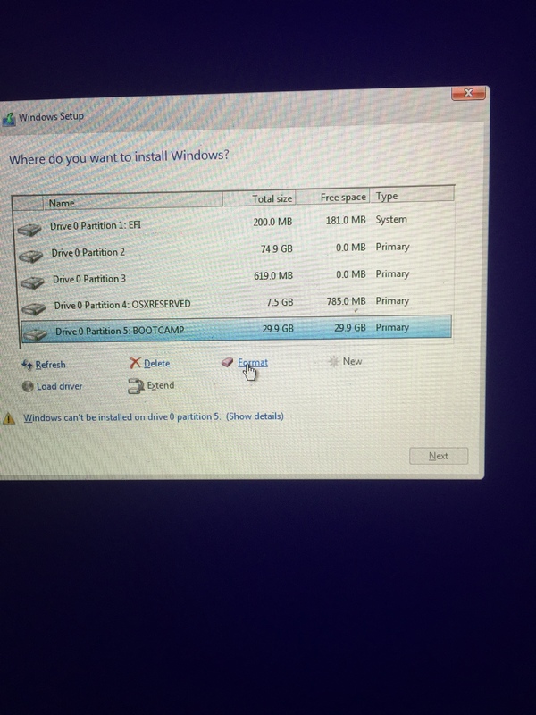 I come unstuck when selecting the partition, please see the error below. I did click format too.