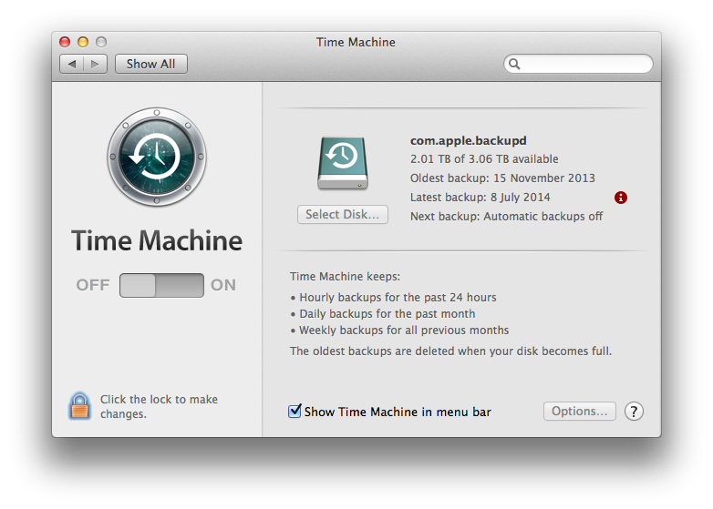 Screenshots of the Time Machine Pane of System Preferences in Mavericks