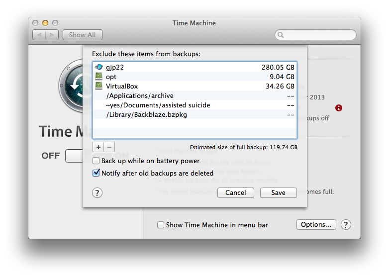 Code:sh-3.2$ sw_vers ProductName: Mac OS X ProductVersion: 10.9.5 BuildVersion: 13F34 sh-3.2$ whoami gjp22 sh-3.2$ defaults read /Library/Preferences/com.apple.TimeMachine SkipSystemFiles 0 sh-3.2$ defaults read /Library/Preferences/com.apple.TimeMachine SkipPaths ( "/Applications/archive", "/Library/Backblaze.bzpkg", "~yes/Documents/assisted suicide" ) sh-3.2$ defaults read /Library/Preferences/com.apple.TimeMachine ExcludedVolumeUUIDs ( "AD0D732F-9769-32D0-A4E7-8E8554705BE1" ) sh-3.2$ defaults read /Library/Preferences/com.apple.TimeMachine ExcludeByPath ( "/Users/Shared/adi", "/Volumes/gjp22/Library/Application Support/DriveGenius/Logs", "/Users/gjp22/Library/Application Support/DriveGenius/Logs", "/Users/gjp22/Library/LaunchAgents/com.prosofteng.DGMonitor.plist", "/Library/Application Support/Microsoft/PlayReady", "/Library/Application Support/DriveGenius" ) sh-3.2$ ls -@dl /Users/yes/Documents/top\ secret ls: /Users/yes/Documents/top secret: Permission denied sh-3.2$ sudo ls -@dl /Users/yes/Documents/top\ secret drwxr-xr-x@ 2 gjp22 wheel 68 1 Jan 08:43 /Users/yes/Documents/top secret com.apple.metadata:com_apple_backup_excludeItem 61 sh-3.2$ ls -l /Library/Preferences/com.apple.TimeMachine.plist -rw-r--r-- 1 root wheel 74238 1 Jan 08:58 /Library/Preferences/com.apple.TimeMachine.plist sh-3.2$