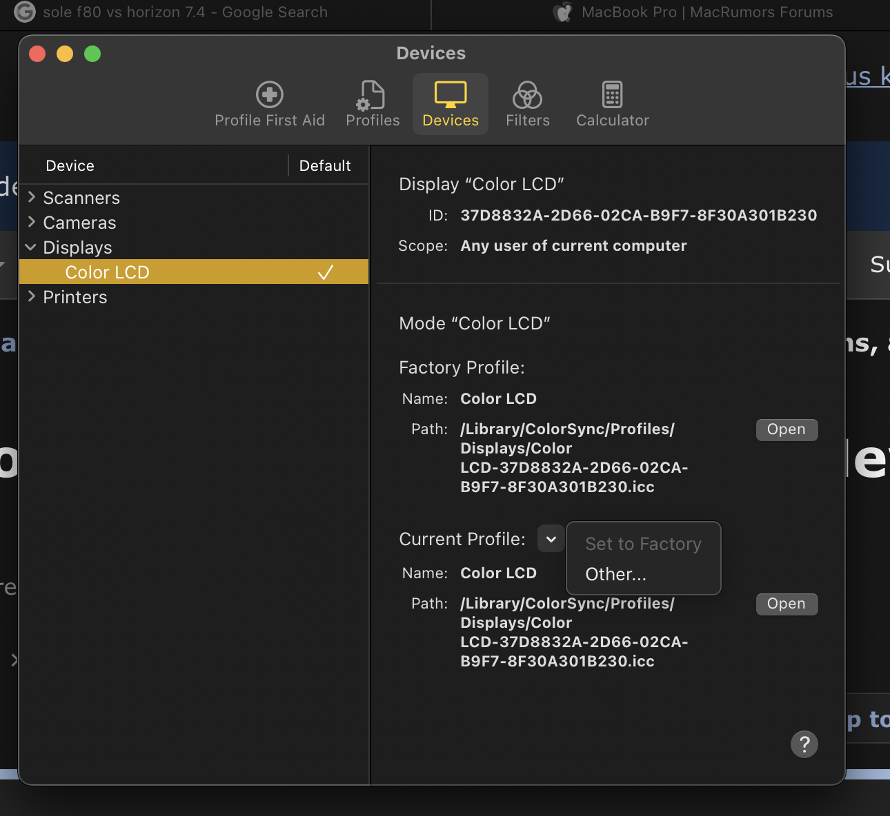 Click on 'Color LCD' (this is the default profile that your MacBook Pro is currently using), and then go to the right side of that window, and click the drop down arrow next to 'Current Profile' and choose 'Other'.