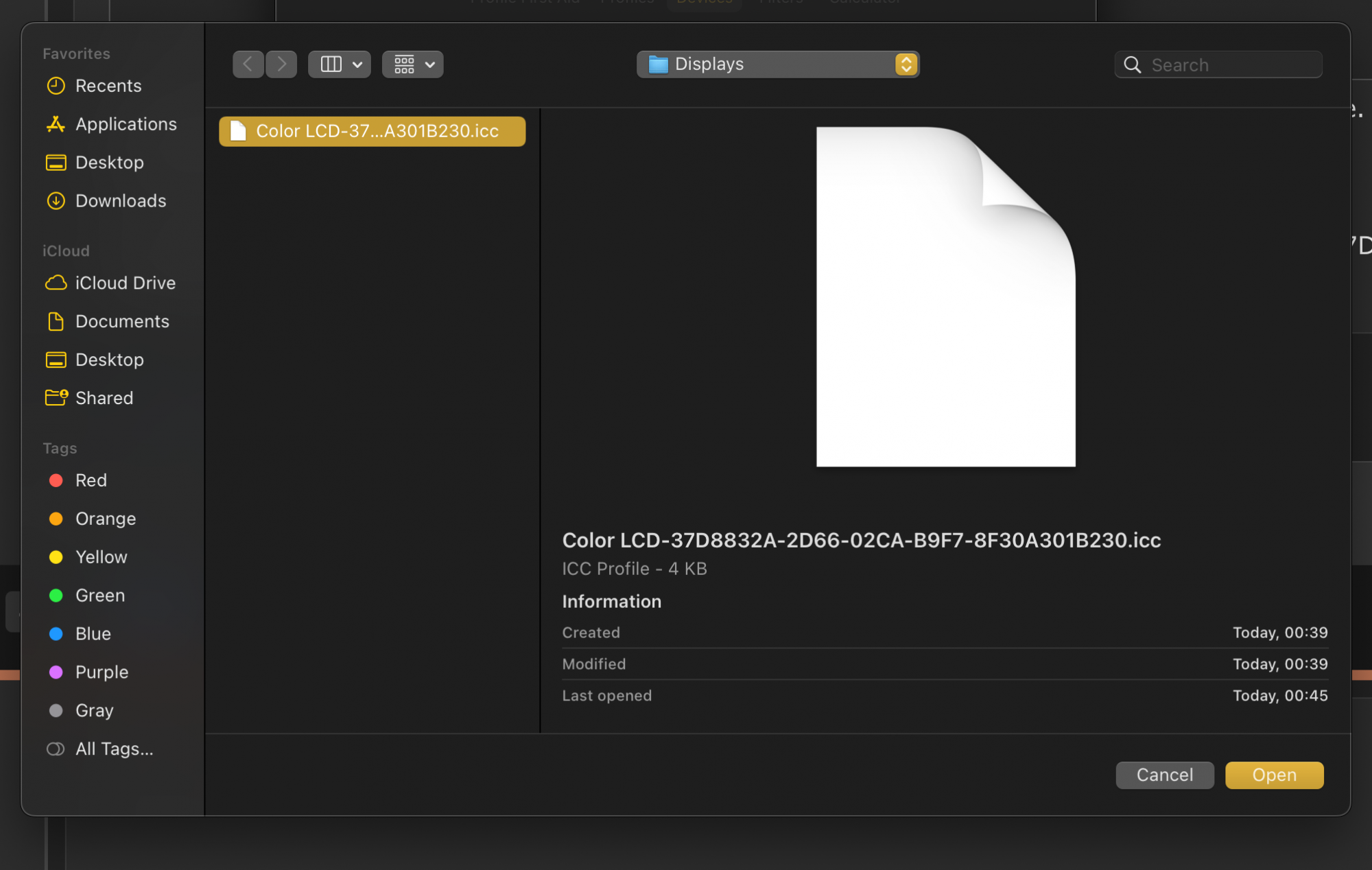 This will bring up the folder window where the default color profile (and now your newly created color profile) is saved. Select your newly created color profile and click 'Open'.