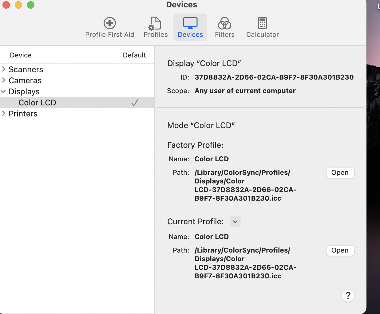 Now, launch the ColorSync Utility app in the Utilities folder, click on 'Devices' on the tool bar, then click the drop down arrow next to 'Displays' on the left side of that window.