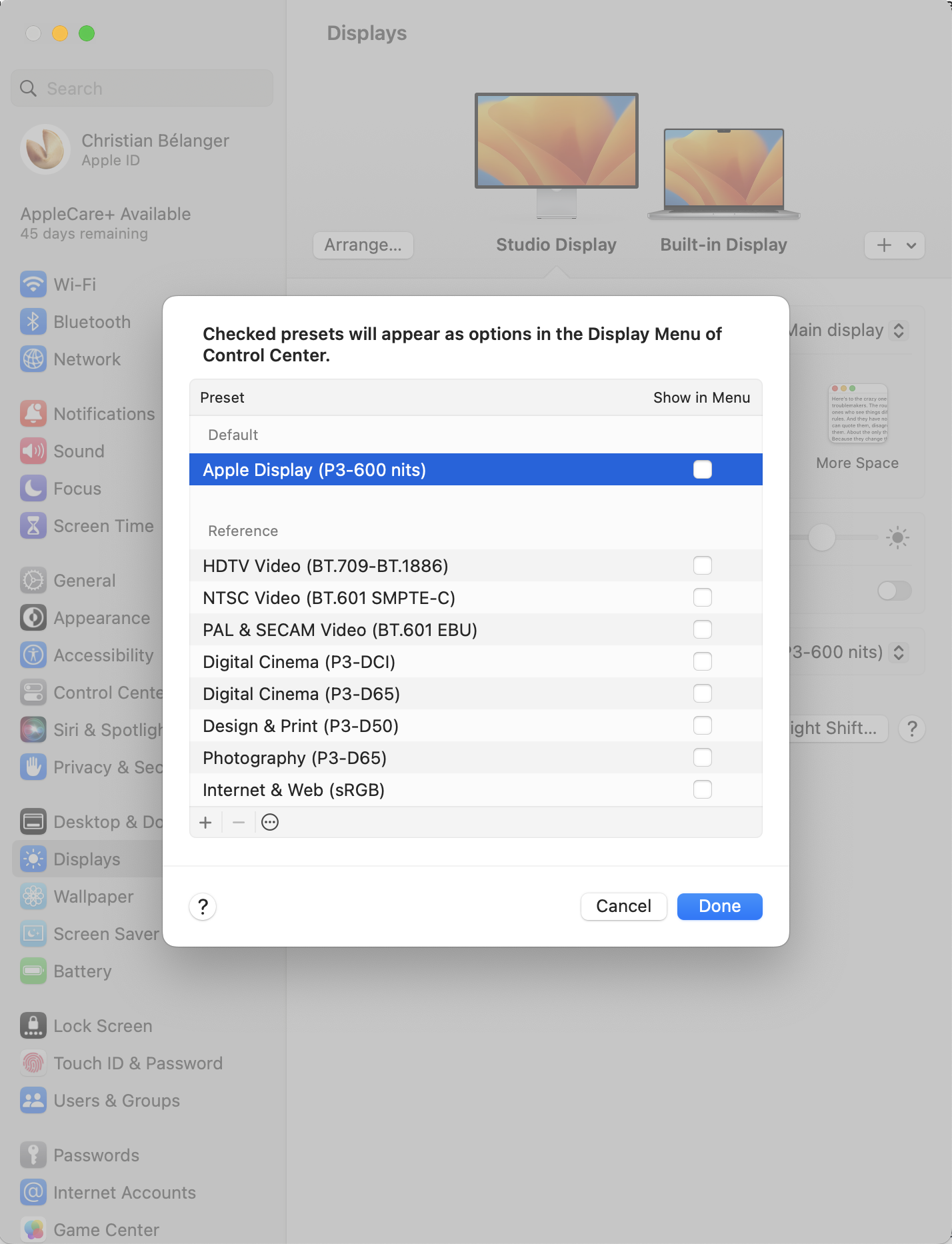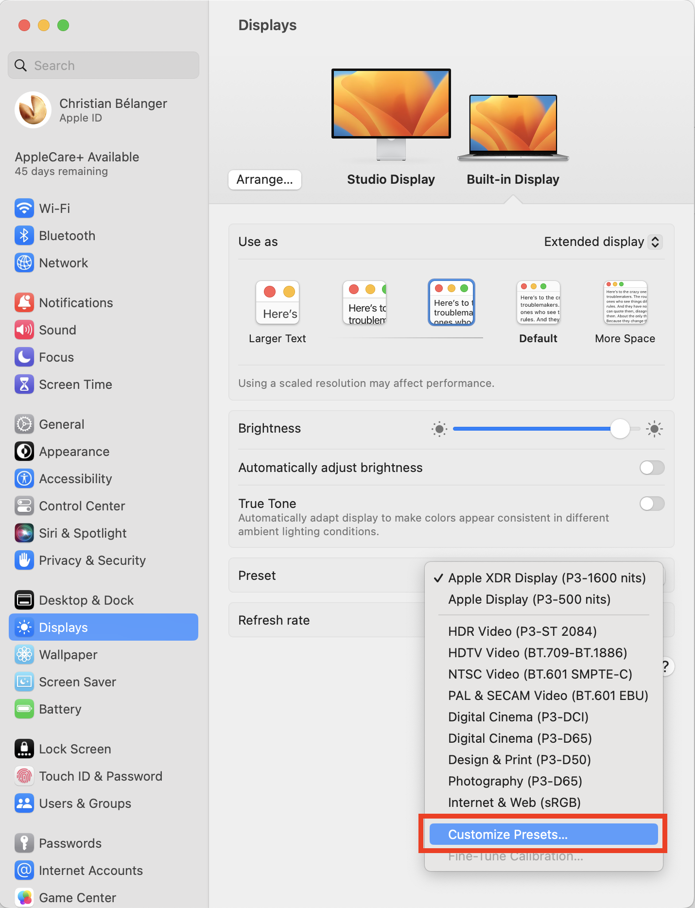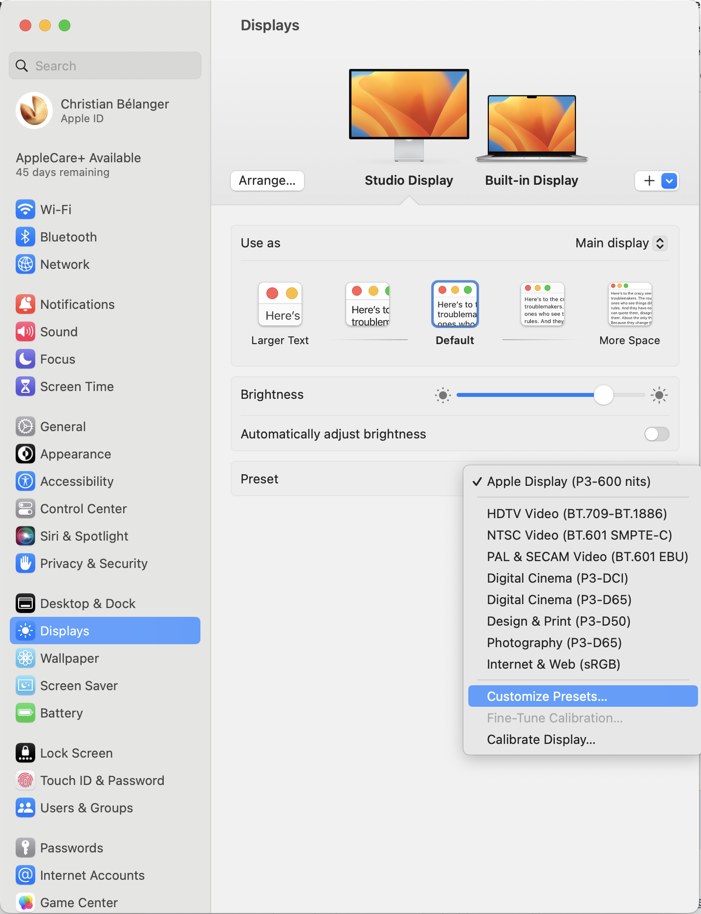 I'm on Ventura 13.5.2, and the only way I can access Expert Mode with multiple monitors is if I do option+click on THIS window:No. There is no way to get the color profiles to stay. They will stay with the screensaver on (which can lock your mac), but as soon as the display sleeps or goes off, it goes back to default. There has been no way to get around this and it is ridiculously dumb. I have the colorsync utility in a shortcut and just change it back, which takes about five seconds, but it is just very dumb.