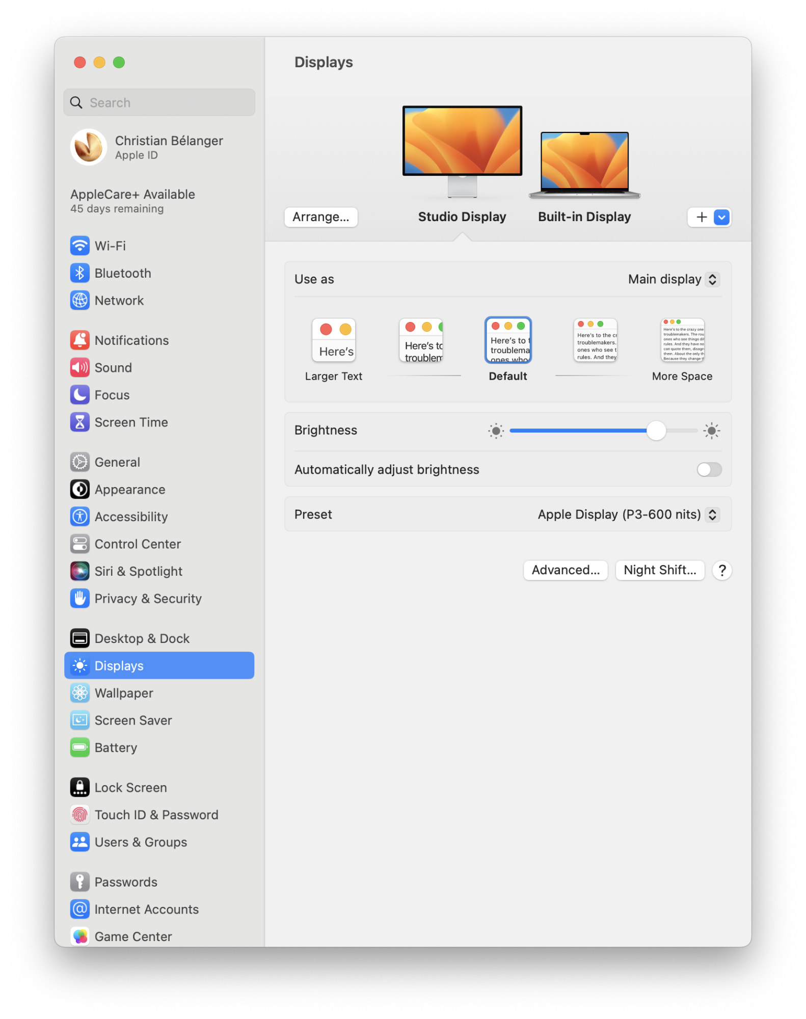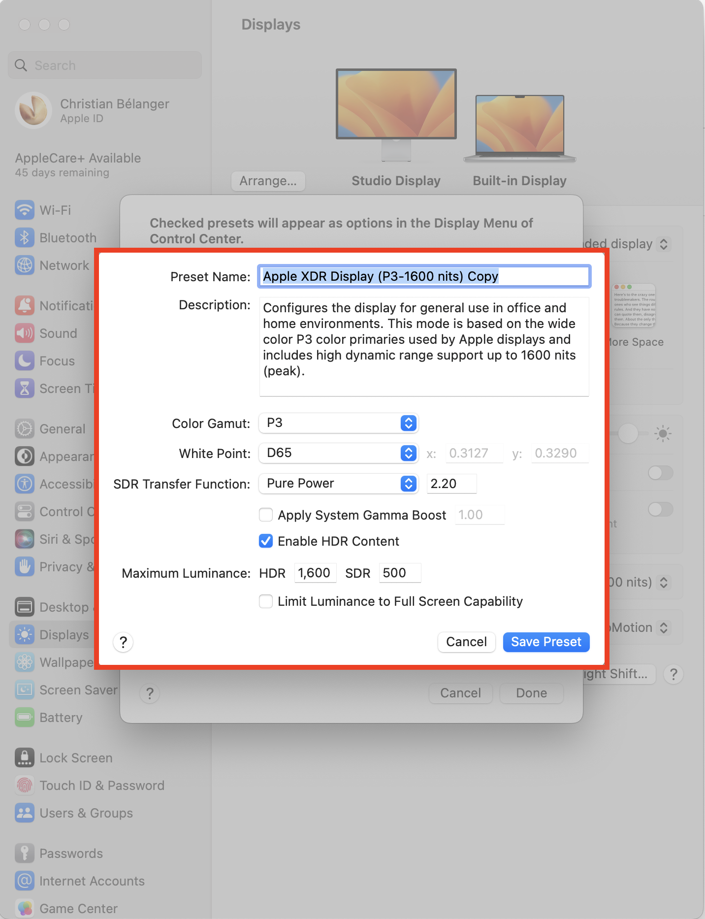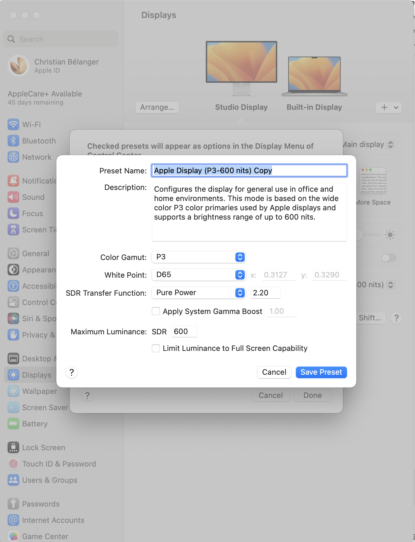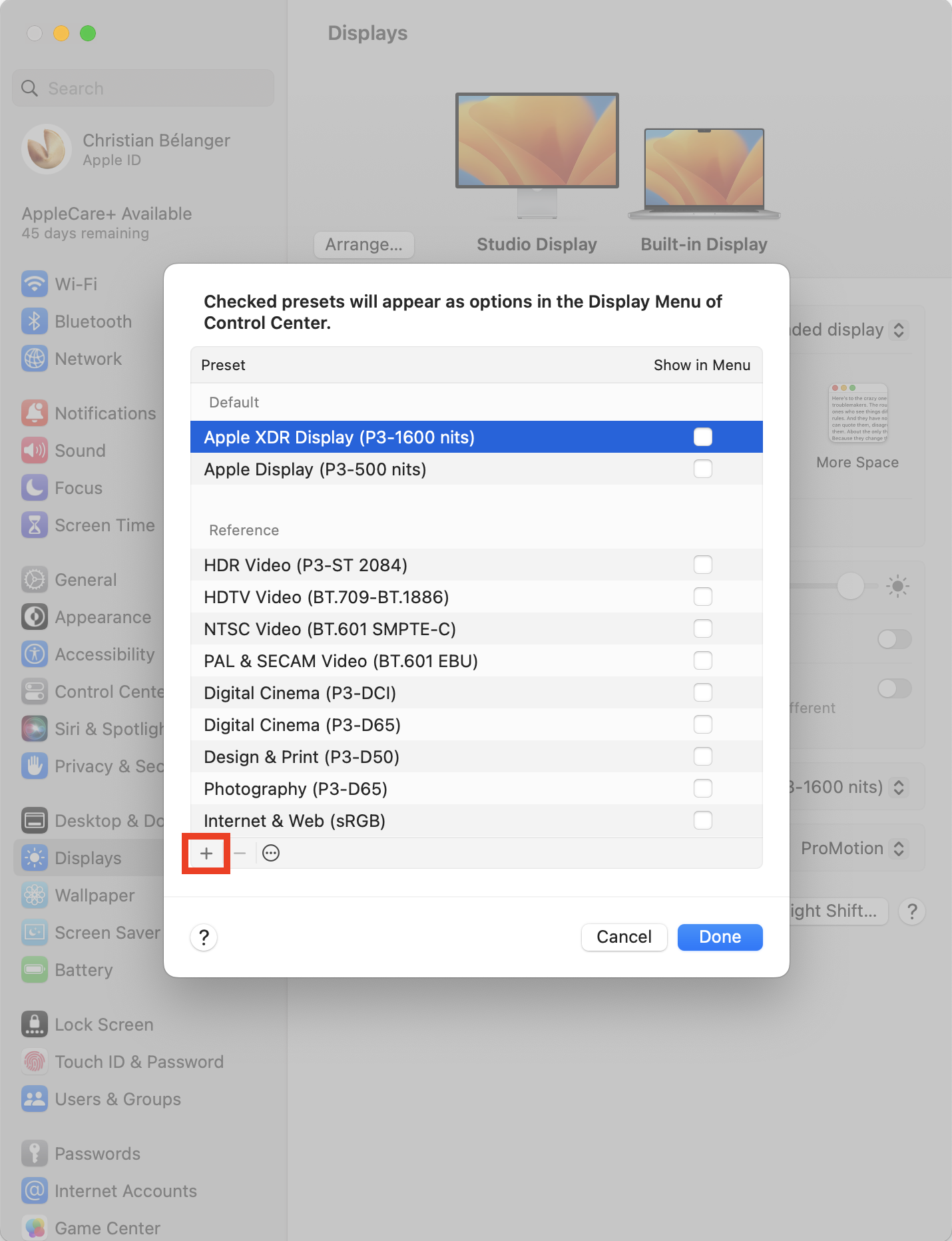I'm on Ventura 13.5.2, and the only way I can access Expert Mode with multiple monitors is if I do option+click on THIS window:No. There is no way to get the color profiles to stay. They will stay with the screensaver on (which can lock your mac), but as soon as the display sleeps or goes off, it goes back to default. There has been no way to get around this and it is ridiculously dumb. I have the colorsync utility in a shortcut and just change it back, which takes about five seconds, but it is just very dumb.