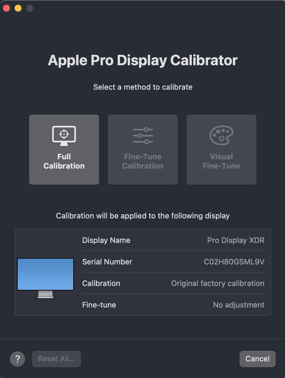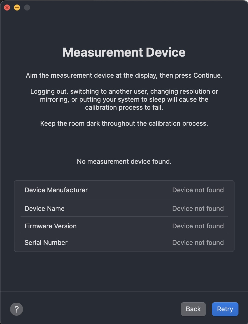 When I attempt to use the "Pro Calibrator" software that seems to be native to macOS (& new?), it detects my Pro Display XDR, but it does NOT detect my colorimeter. Fine Tune is not even an option (perhaps that only comes into play after a profile is created with THAT software).