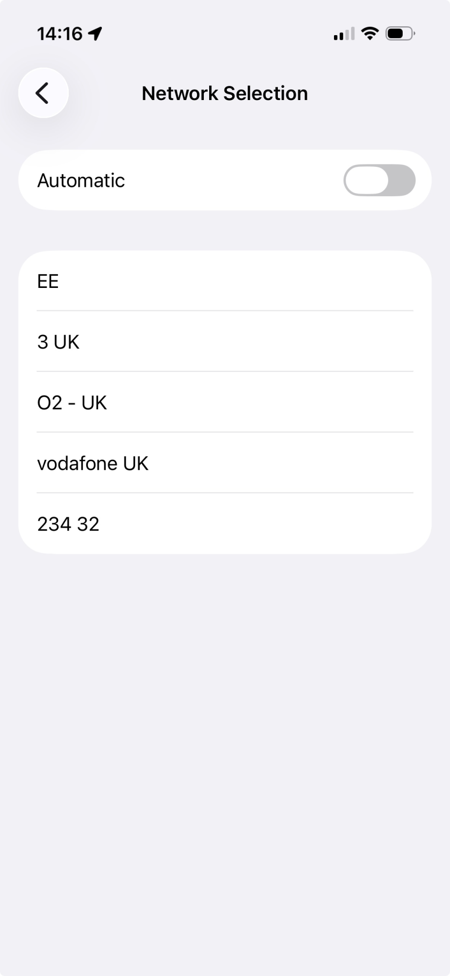 On the 17, I cannot change (manually select) a carrier. When I turn off "automatic", it's just a blank/empty screen.
