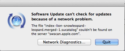 Tried to check for updates on my OS X Lion MBP and it gives me "Software Update can't check for updates because of a network problem". The file index-lion-snowleopard-leopard.merged-1.sucatalog couldnt be found on the server swscan.apple.com. Anyone else having issues with this? My internet connection is running just fine. First time I've seen this message as it has been updating previously without any problems.