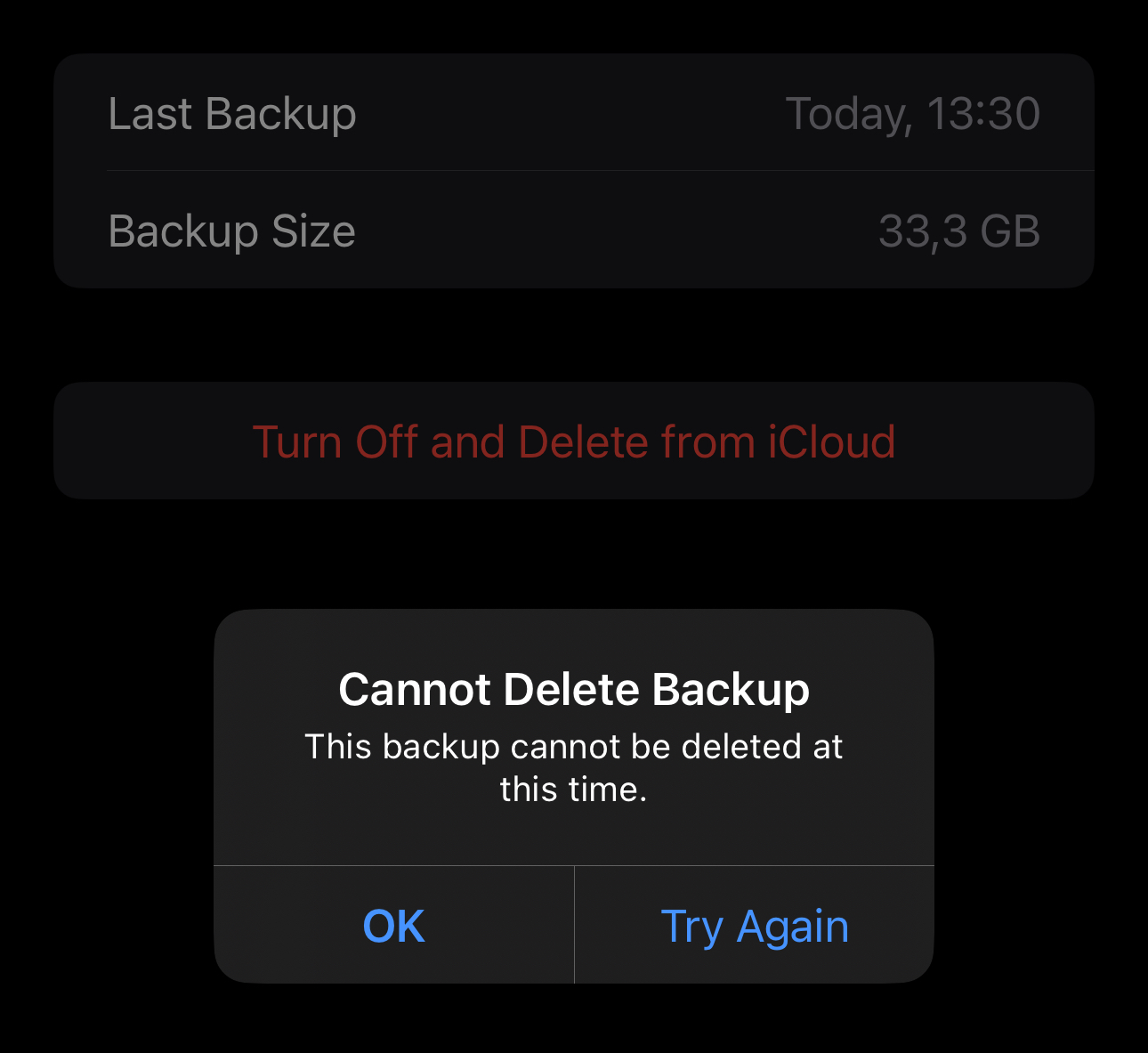 Unfortunately when I select "Turn Off and Delete from iCloud" and confirm with "Permanently Delete" I receive the error message "This backup cannot be deleted at this time". (see attached screenshot)