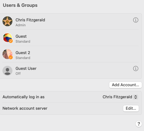 chrisfitz said: Yes Click to expand... Are you asking about Guest Users, not regular users? If so, if you enable Guest Users (which shows as off), does the info option appear for those account so you can uncheck Allow guests to log into this computer? Change Guest User settings on Mac Let guest users temporarily use your Mac without adding them as individual users. support.apple.com