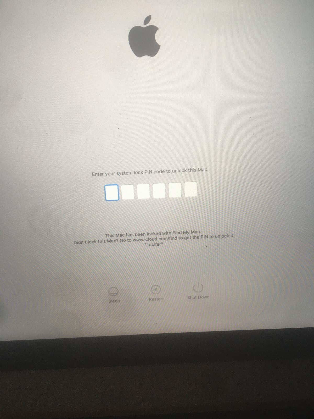 My Macbook is suddenly locked and unusable. It asks for a six-digit "system lock pin code" and says to go to icloud.com/find (see attached image). It also displays the custom message "Lucifer", which would seem to suggest some kind of hacker may be behind this. The strange thing is that the device is registered to my iCloud account and shows up under "My Devices" at icloud.com/settings. But it doesn't appear at icloud.com/find. So, how do I unlock it?