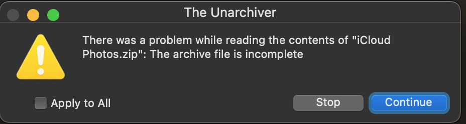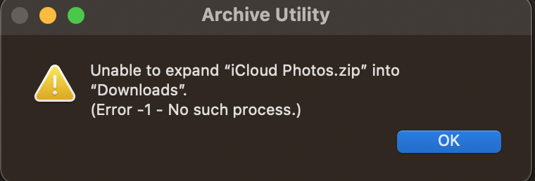 I am trying to download all my photos and videos from the Photos app. I have just over 12,000 and is a mixture of photos and videos (80% photos). All the originals are downloaded on the Mac in the library. When I try to export them all it just hangs. When I try to do it in 200/300/500/1000 at a time etc , it just hangs. I go onto iCloud.com and try to download the originals and they download in 1000 at a time. The zip file is always corrupt and says "Error 1 No such process". I have tried various other apps such as stuffit expander, the unarchiver, unzip etc and not 1 will do it. How the hell do I get them all to download? I want to start a fresh with a new appleid/iCloud account and can't get MY photos and videos from Apple. I wish I had known this before going all in on Apple!