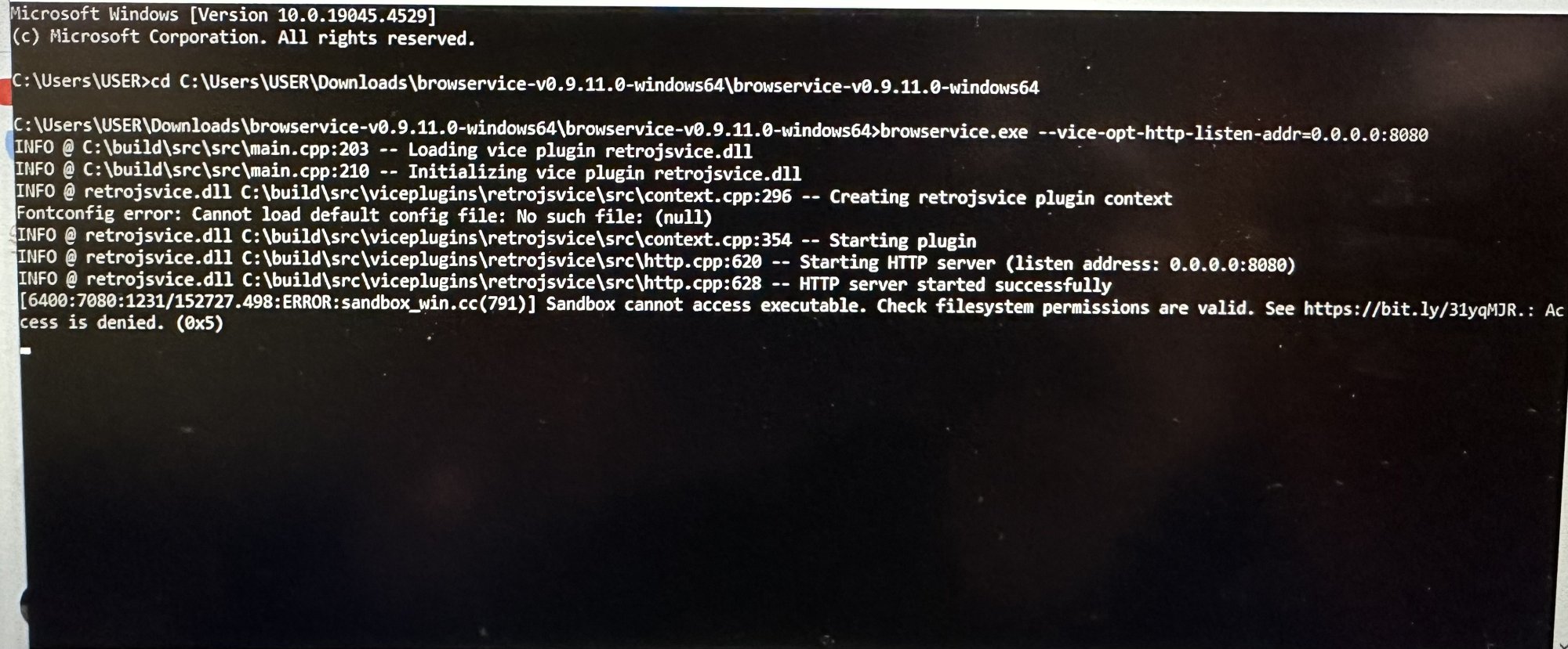 Hey guys i'm trying to browse the web on my g5 mac running 10.5 leopard but i can't get it to work. I'm hosting browservice on a windows 10 laptop and the server starts up fine. I am connecting my g5 mac directly to my windows host machine with an ethernet patch cable. I haven't defined a static ip adress to the g5 it gets it automatically from DHCP. It gets internet access, i can even search on google with the old safari browser. But when i enter the browservice ip adress "http"://127.0.0.1:8080" in the link bar nothing happens, or it says can't connect to the website. I have tried internet explorer 5 which should work and sea monkey browser because i saw a macrumors post where a guy got it working. i've also tried the this command --vice-opt-http-listen-addr=0.0.0.0:8080 and trying to connect, but nothing happens. I don't know what i am doing wrong. Also for some reason after around 20 minutes i get some error on the server about not having access to files. Can someone that has gotten it working help me?