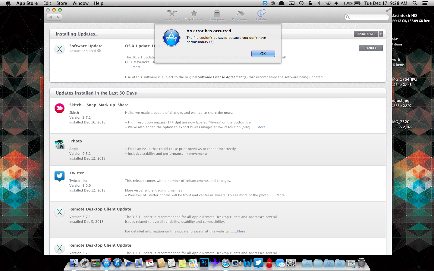 I tried downloading the offline 10.9.1 update and it just reboots and doesn't install.