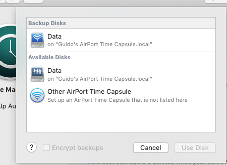 When I wanted to reinstall some of my stuff from Time Machine>open time machine preference>data--g's airport time capsule, is greyed out.if I "select disk" a new window opens