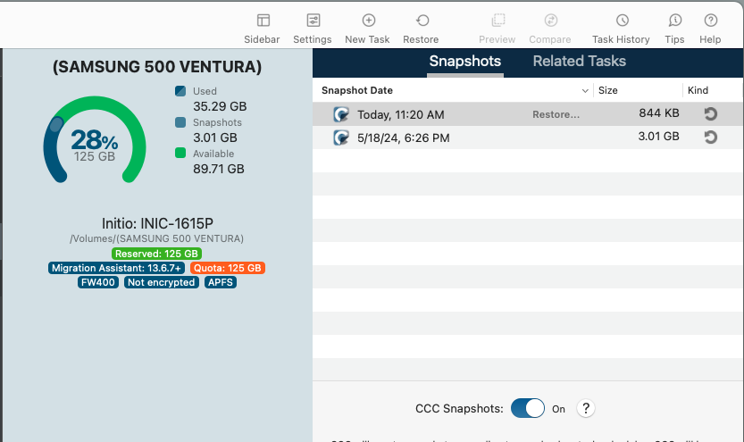 Something I'm still trying to get my head around re. snapshots: why is it that the size of a snapshot on a particular date can vary so much in size? For example, today, latest, after running update is 844 KB and the previous after running update, for 5/18/24, is 3.0.1 GB?Appreciate the replies on this topic. My strategy re. snapshots going forward will be pretty much to use the CCC defaults - since I'm always running CCC manually, backing up only every few days- while pruning when things begin to look too large.