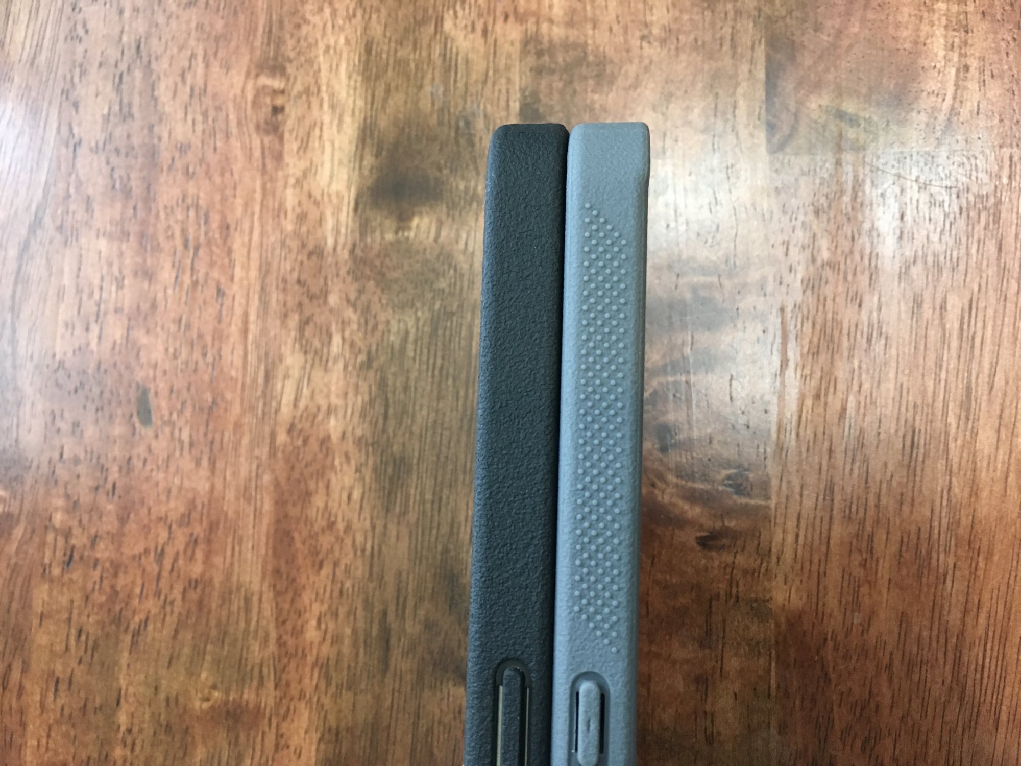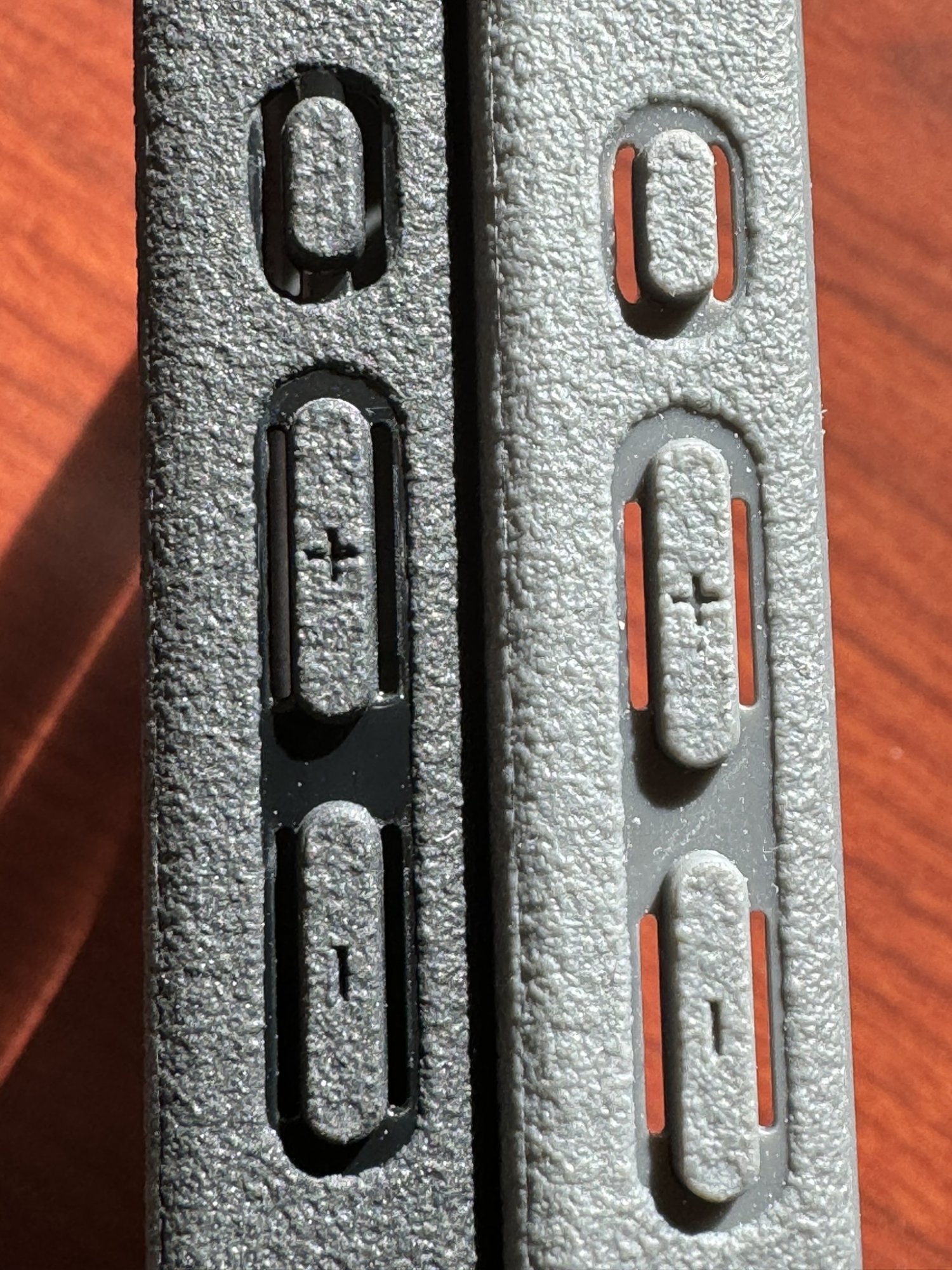 1) The slits on the black case (L) have been elongated to mimic the feel of the side button on the right side of the case, which always functioned properly. Those buttons now feel just as tactile as those on my other two cases which work perfectly, the Pitaka MagEZ Case Pro 4, and the Elago silicone, which unlike the Sheath's molded-in buttons, are metal & plastic and press-fit into the case.