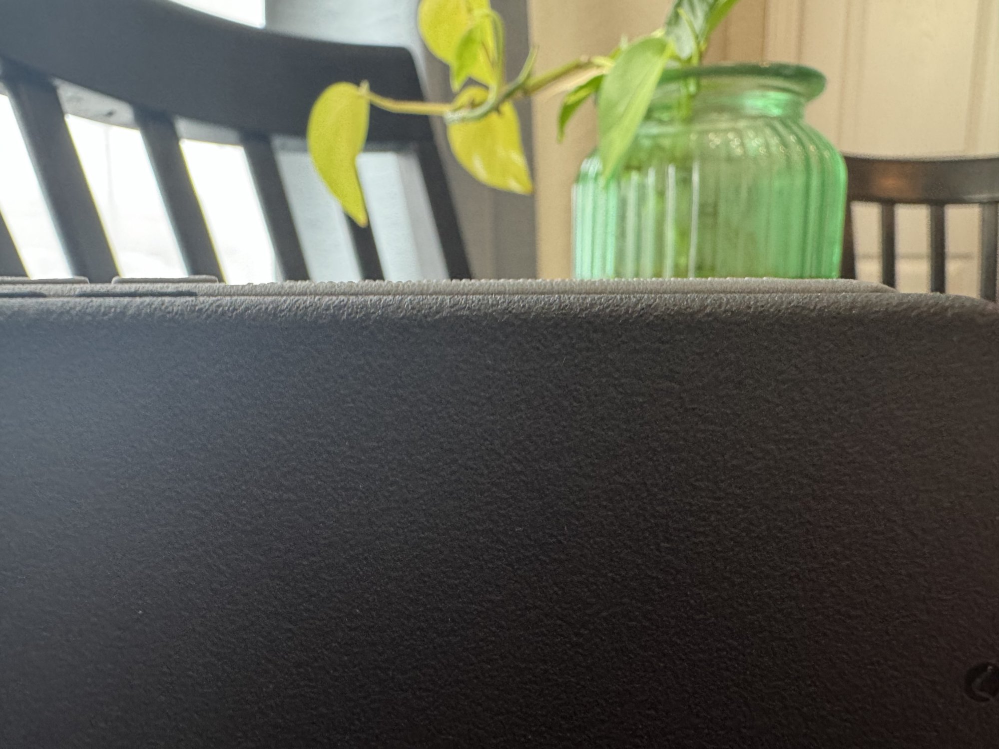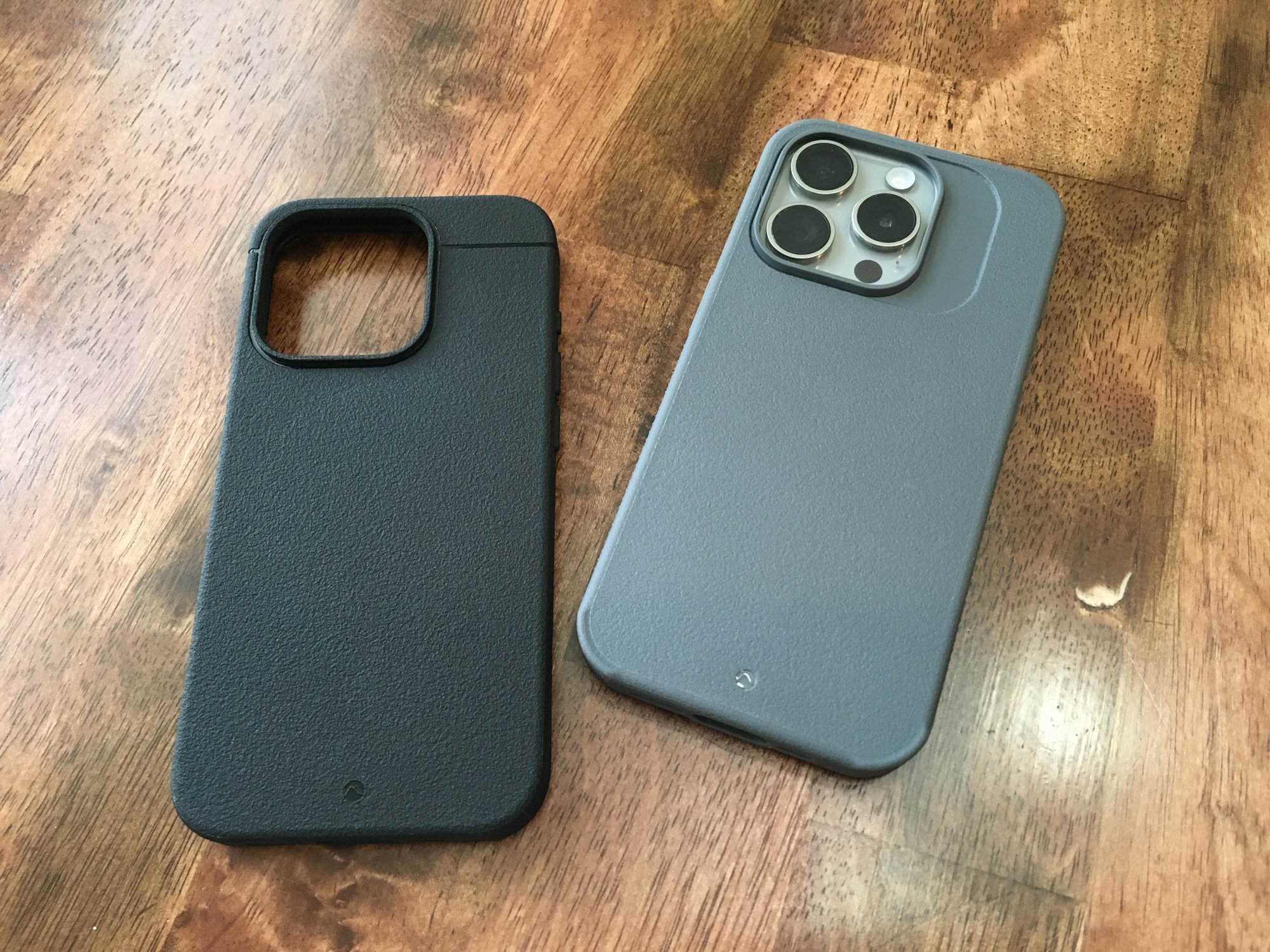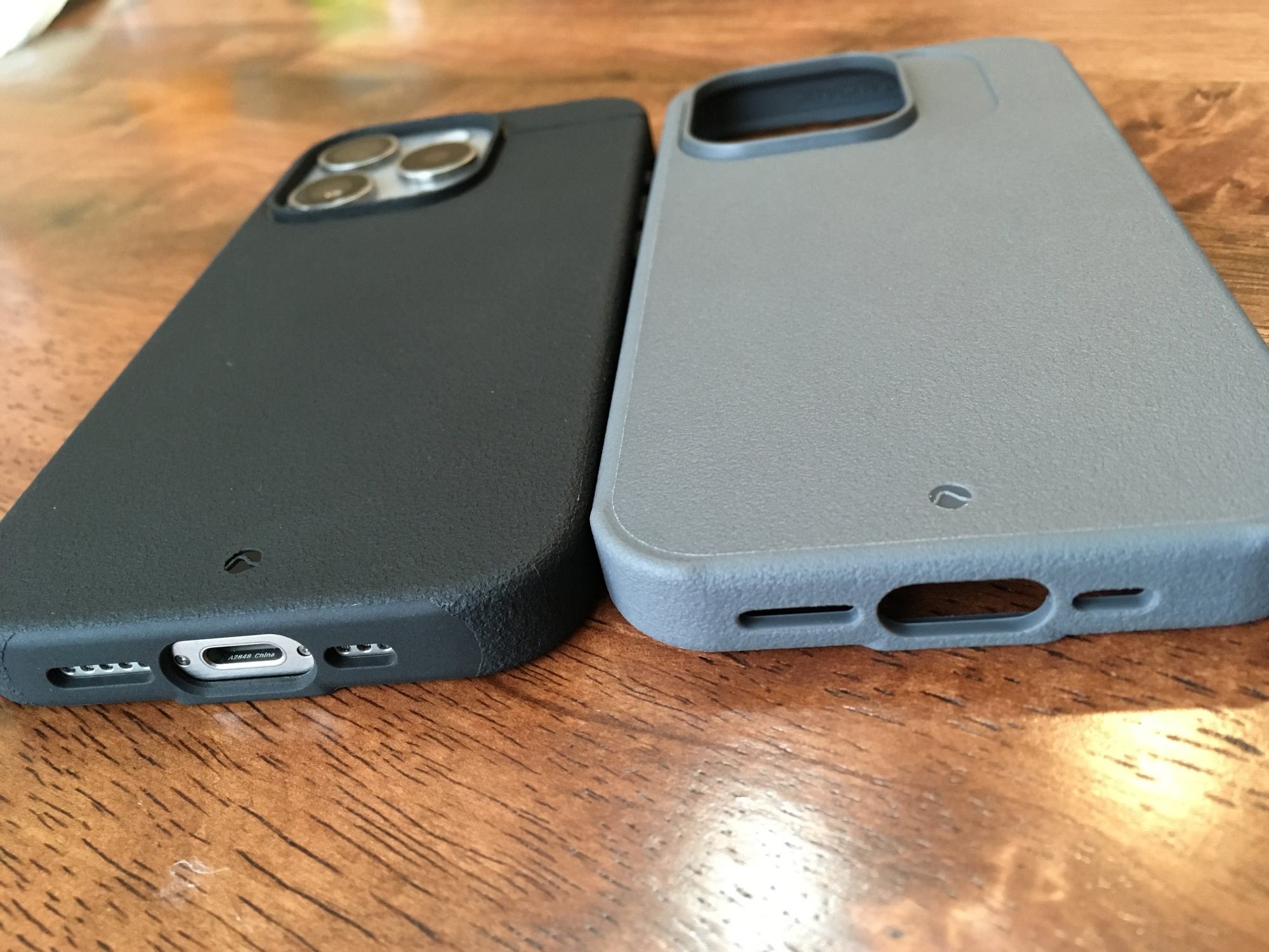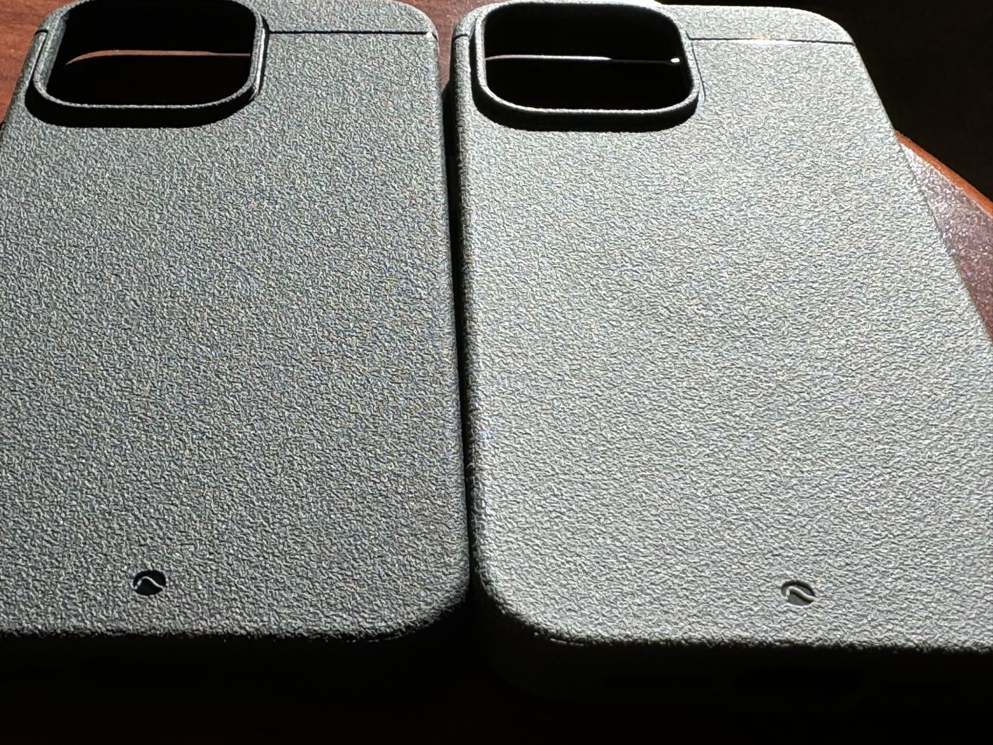 2) The new black case doesn't show any initial ring impression as did the one it replaced, the gray one on the right, whose circular imprint is slightly more evident due to use than when I first received it on November 4th. I can't tell by feel if the back material is any thicker on the revised black case but it