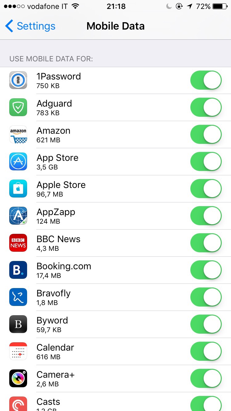 About half an hour later I went out. I checked just before leaving and all my app updates had not really download anything. It seems that, despite me having the app store disabled from using cellular data, as the downloads had all started they merrily continued to download, at lovely 4G speeds, as soon as I stepped out. Within a few minutes I got my provider-sent SMS telling me my roaming package was almost used and when I checked my updates they had all fully updated.