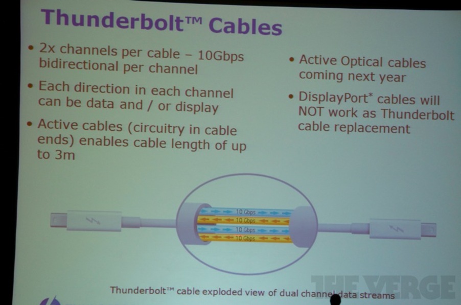 A single Thunderbolt channel is 10Gbps, but every port is dual-channel, and hence 20Gbps. Just because current controllers are limited to 10Gbps of PCIe I/O, doesn't mean that the architecture can be reduced to 10Gbps total bandwidth. The cross-bar switch in a Light Ridge chip looks to be capable of switching no less than 8 10Gbps, full-duplex channels.