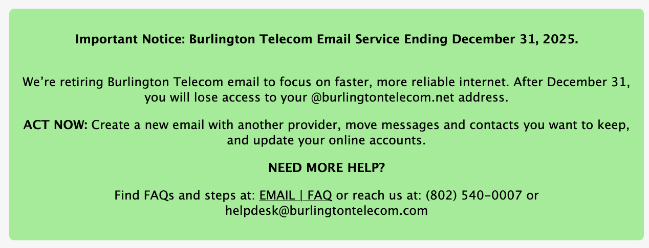 As you posted in the beginning, you said your ISP (Burlington Telecom?) is going to discontinue email at the end of the year.