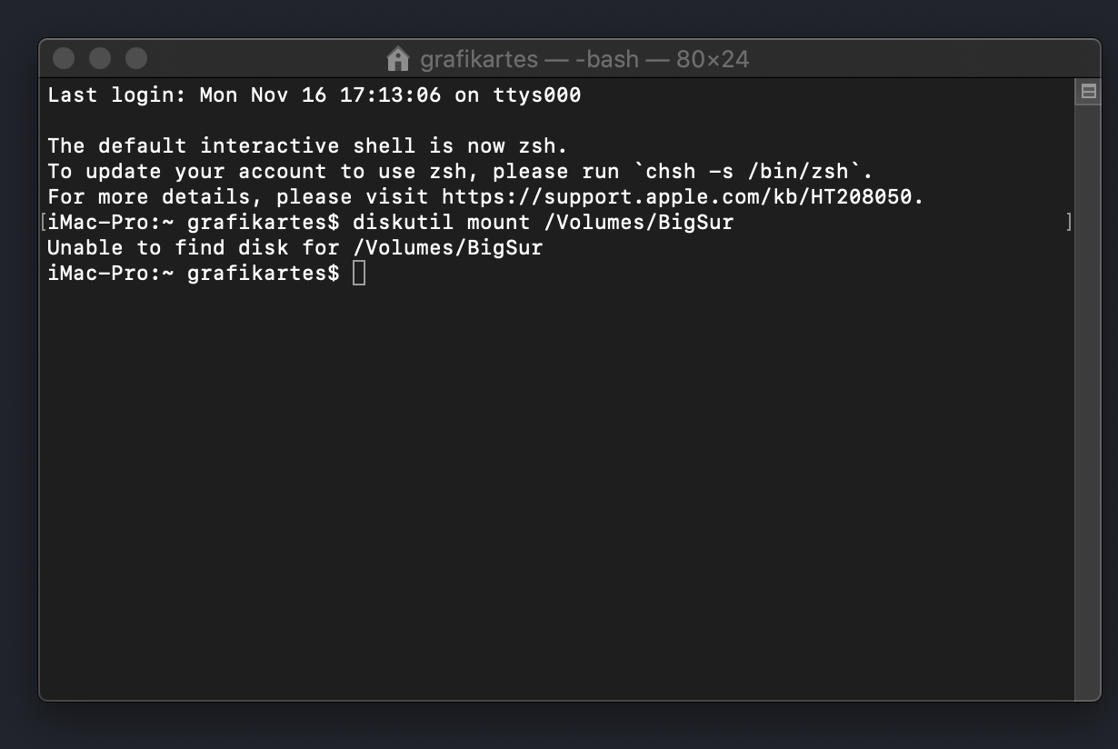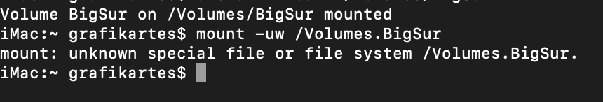NB. in the following, replace 'BigSur' with the name of your BS system volume, replace 'username' with your Home folder's name, replace 'BigSur - Data' with the name of your BS data volume. Remember that spaces in file, folder or volume names require a backslash to be added before the space eg. 'BigSur\ -\ Data'.